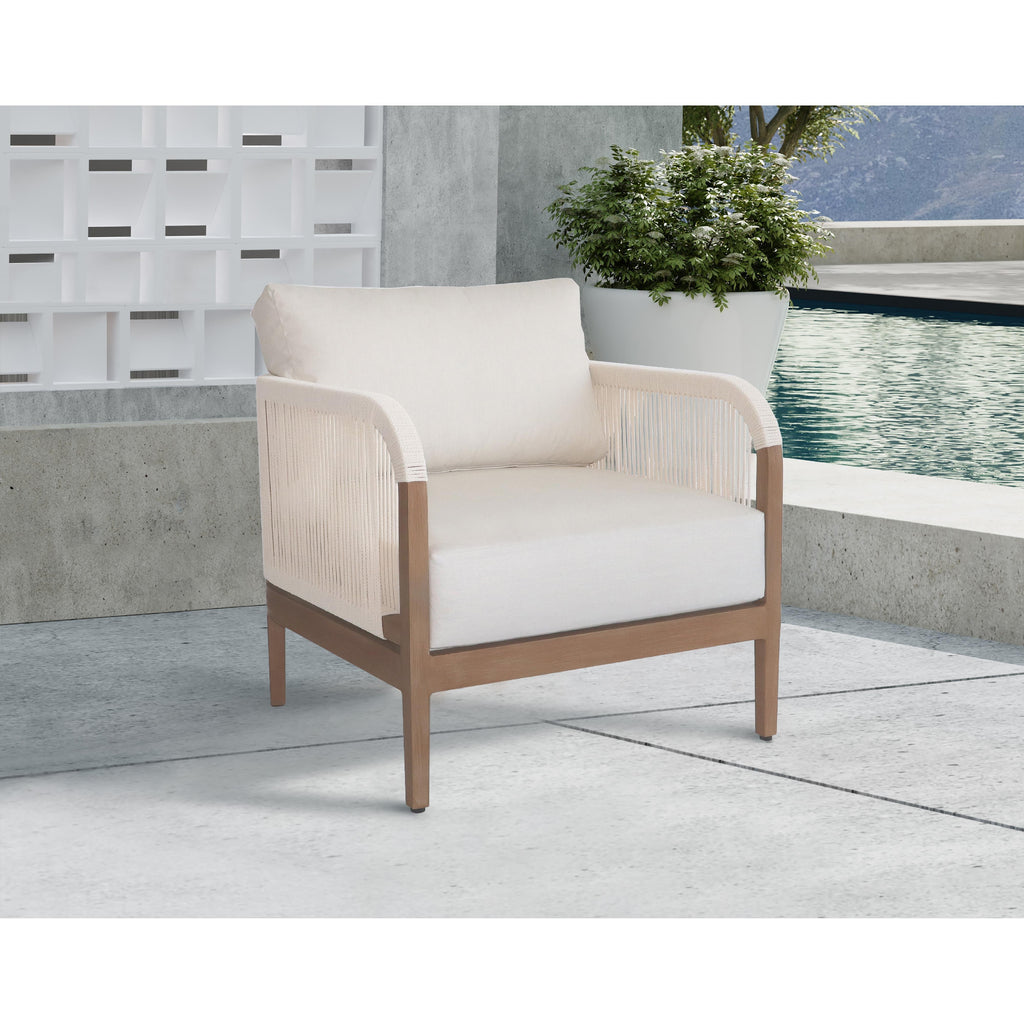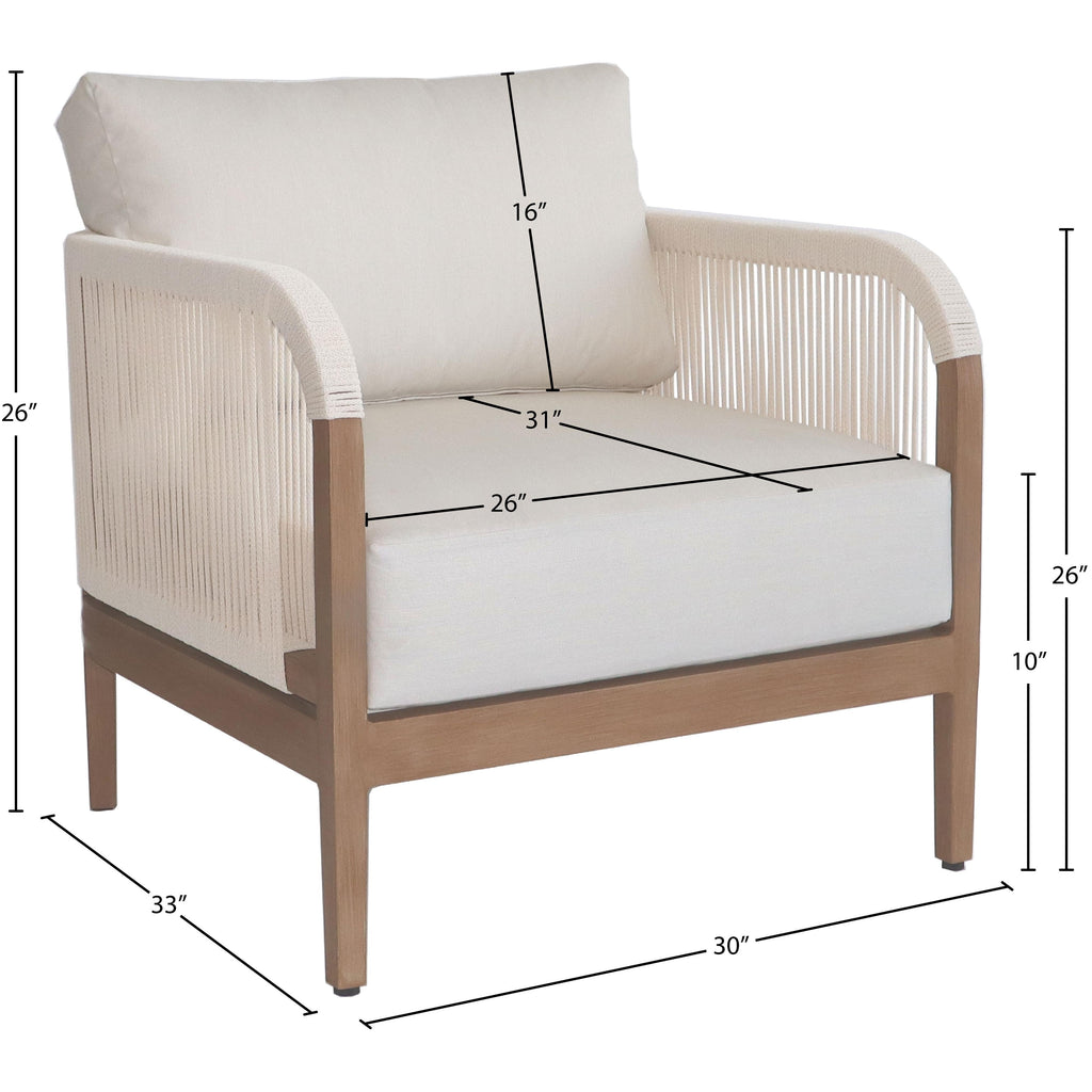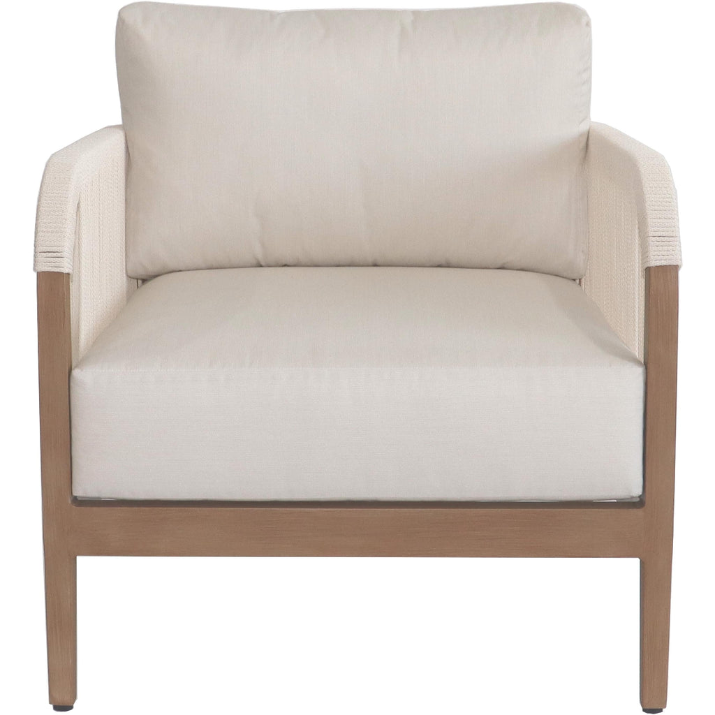 Make your outdoor oasis even more inviting with this Maui Cream Water Resistant Fabric Outdoor Patio Chair. Crafted with an aluminum frame to look like teak without the maintenance requirements, this chair offers both style and convenience. Resilient cream fabric cushions, water-resistant and plump, have quick-dry foam inserts so you enjoy leisure time without worry. With its contemporary resort look, this chair adds sophistication to any patio, porch, or deck setting. Embrace the essence of outdoor comfort and style with this elegant addition - your perfect companion for leisurely moments outdoors.