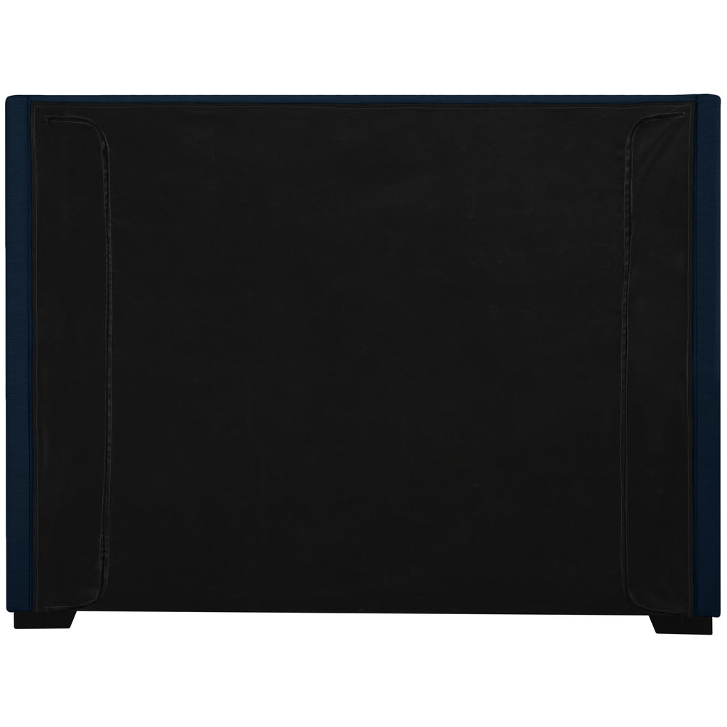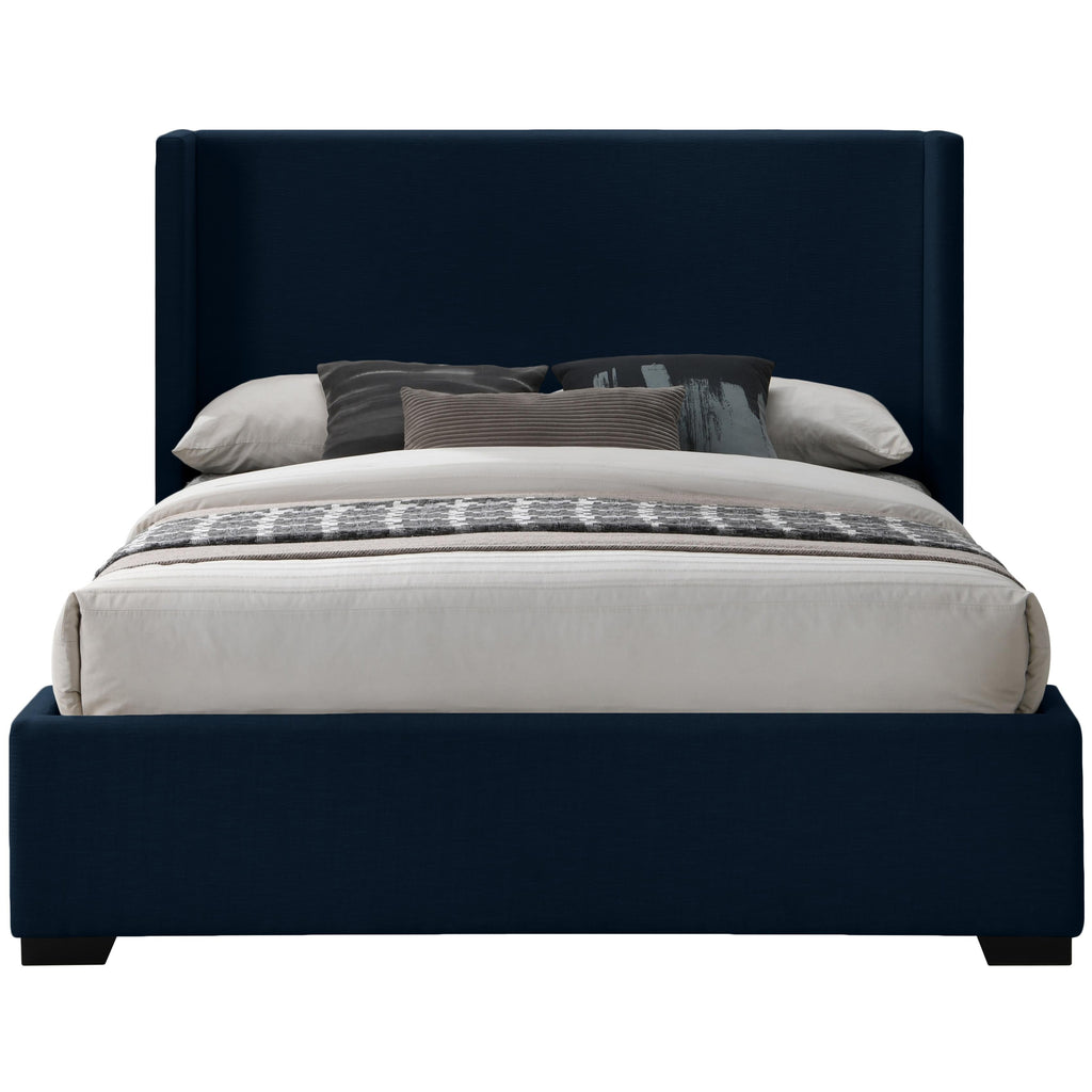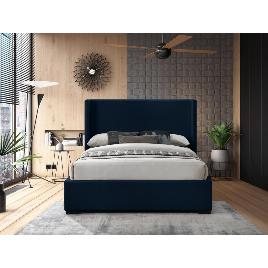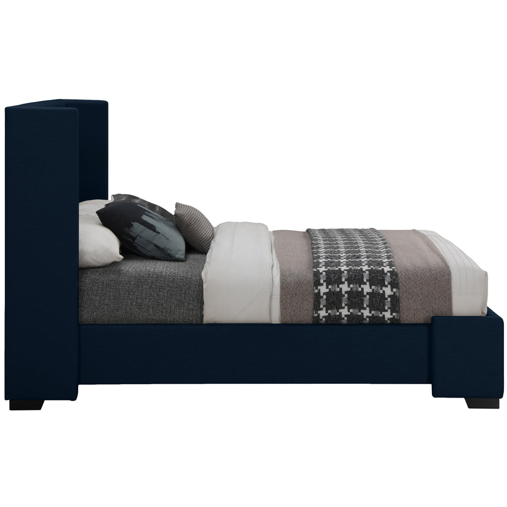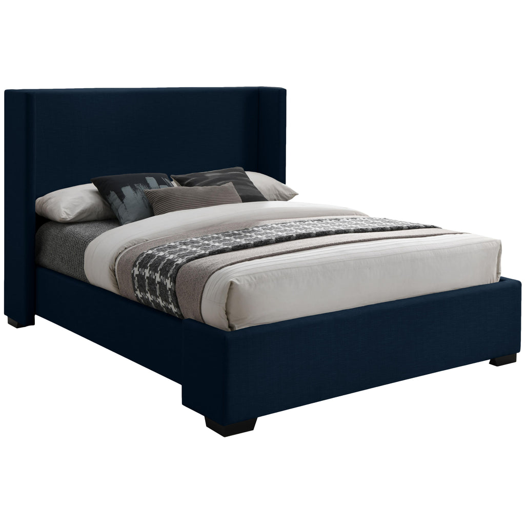 Treat yourself to a fresh new look in your bedroom sanctuary with this queen-size Oxford linen textured bed. This bed features an oversized wing-back headboard for a majestic appearance and is upholstered in rich navy linen textured fabric all over, adding an element of elegance to your room. The espresso legs contrast nicely with the fabric, bringing this midcentury modern design to life. As a bonus, this bed requires no box spring.