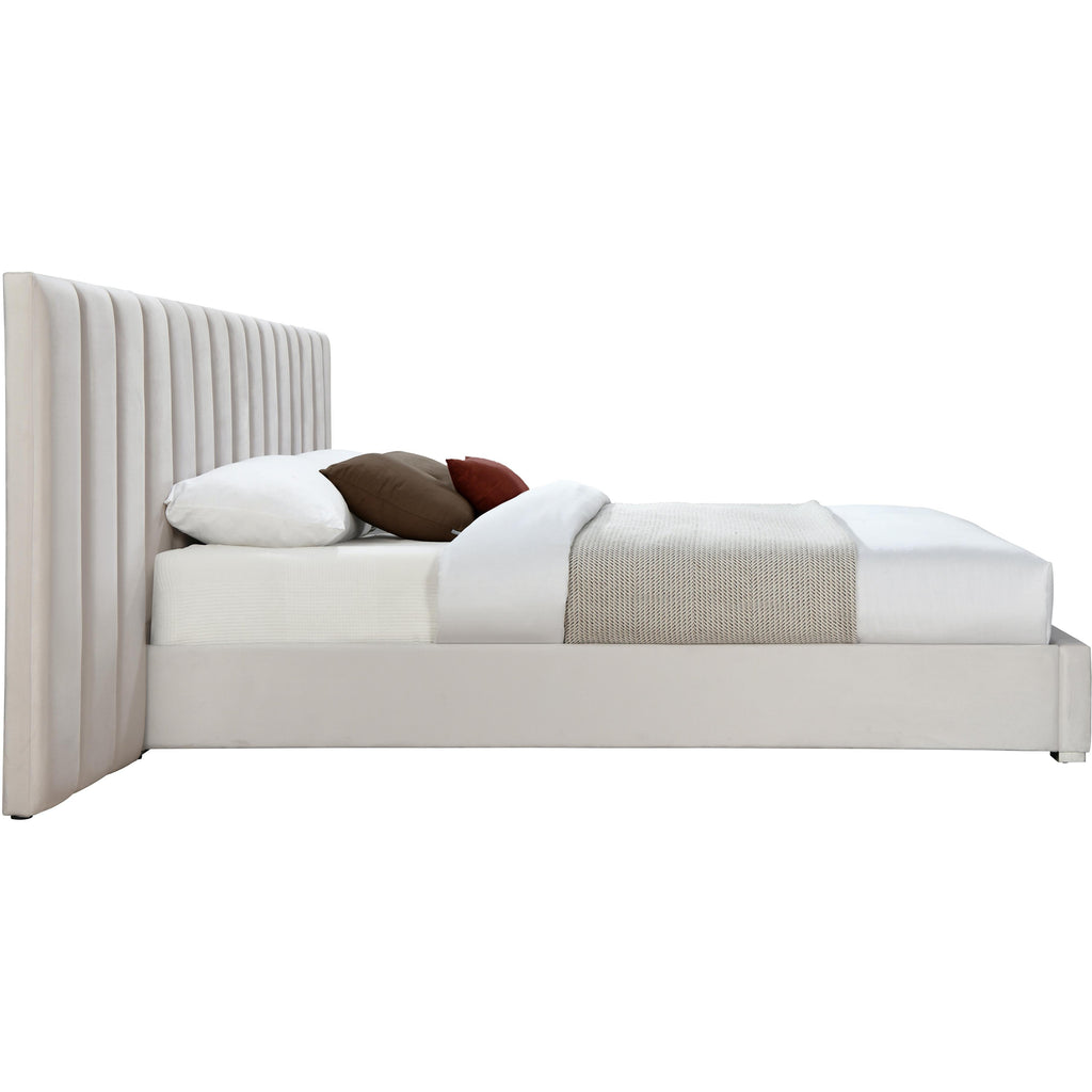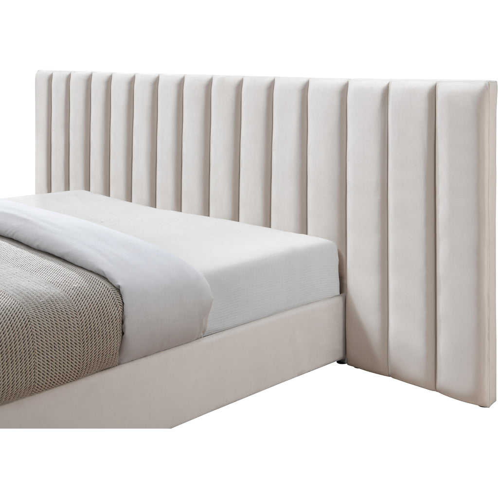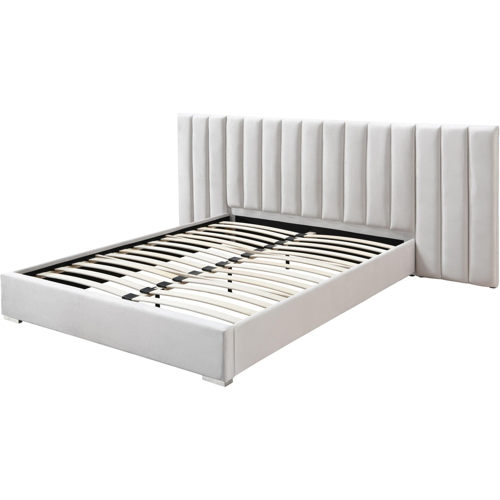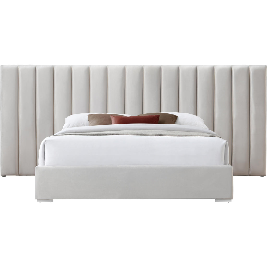 Sleep like royalty in this Pablo queen size velvet bed. This beautiful bed is destined to become the centerpiece of your bedroom sanctuary makeover with its elegantly eye-catching design and soft cream velvet upholstery. The bed rests on sturdy metal feet with a gleaming chrome finish, helping to ensure its strength and resilience for long-term use. Pair it with other items in the Pablo collection for a cohesive and coordinated look.a
