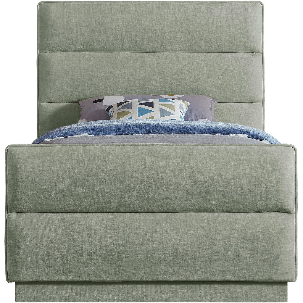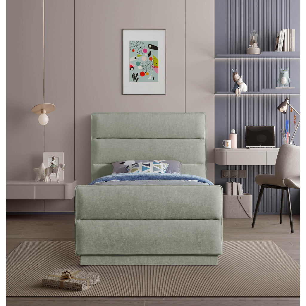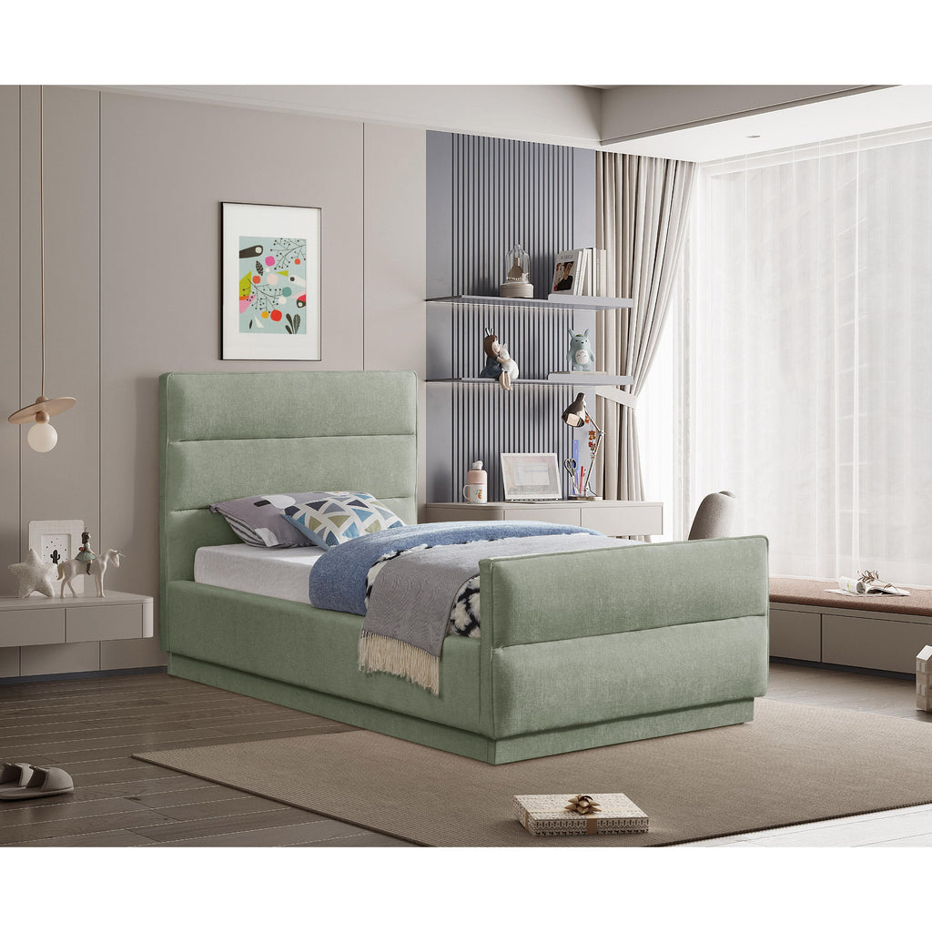 Embrace the essence of cozy sophistication with the Paxton Chenille Fabric Bed, a haven designed to elevate your sleep experience and enhance your bedroom's aesthetics. The bed is adorned in a luxurious rich mint chenille fabric, its soft texture inviting you to sink into its warmth. The subtle sheen of the chenille adds a touch of elegance, creating a timeless look that complements various decors. The headboard features a classic horizontal channel tufted design, adding visual interest and dimension to the bed. This sophisticated detail exudes a touch of vintage charm, making the Paxton a perfect fit for both traditional and contemporary spaces.