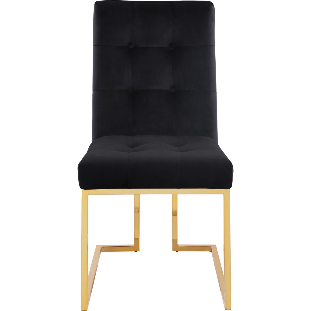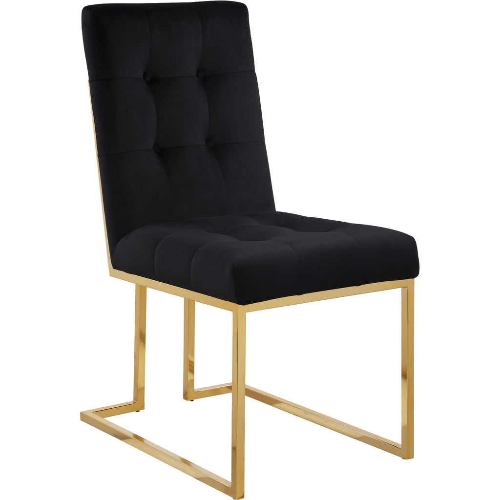 Elevate your dining experience with this Pierre black velvet dining chair. A boxy geometric shape makes this chair an uber modern addition to your space, while a base of stainless steel makes it durable and tough, so it holds up to heavy daily use. The gold tone finish on the base contrasts nicely with the black velvet upholstery used on the seat and back. Heavy tufting adds to the rich appeal of this beautiful design.