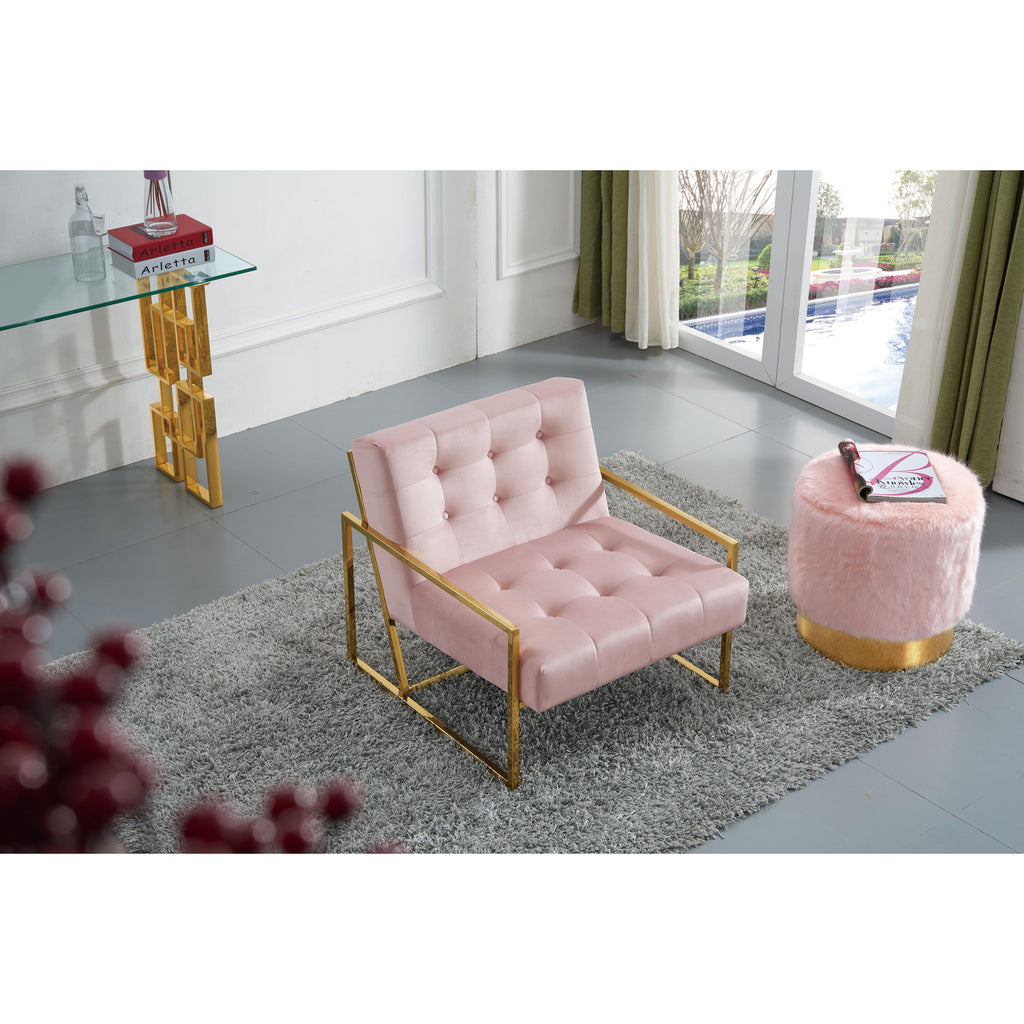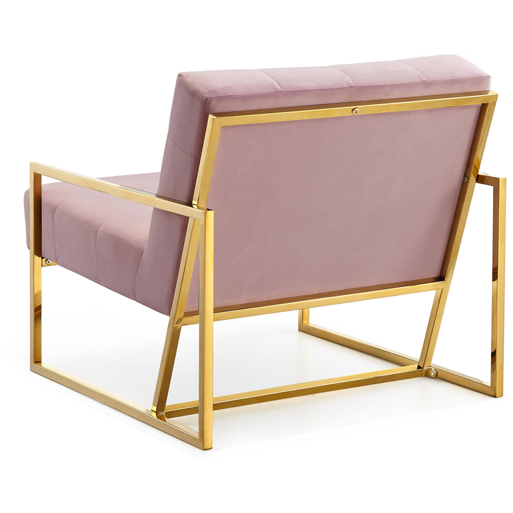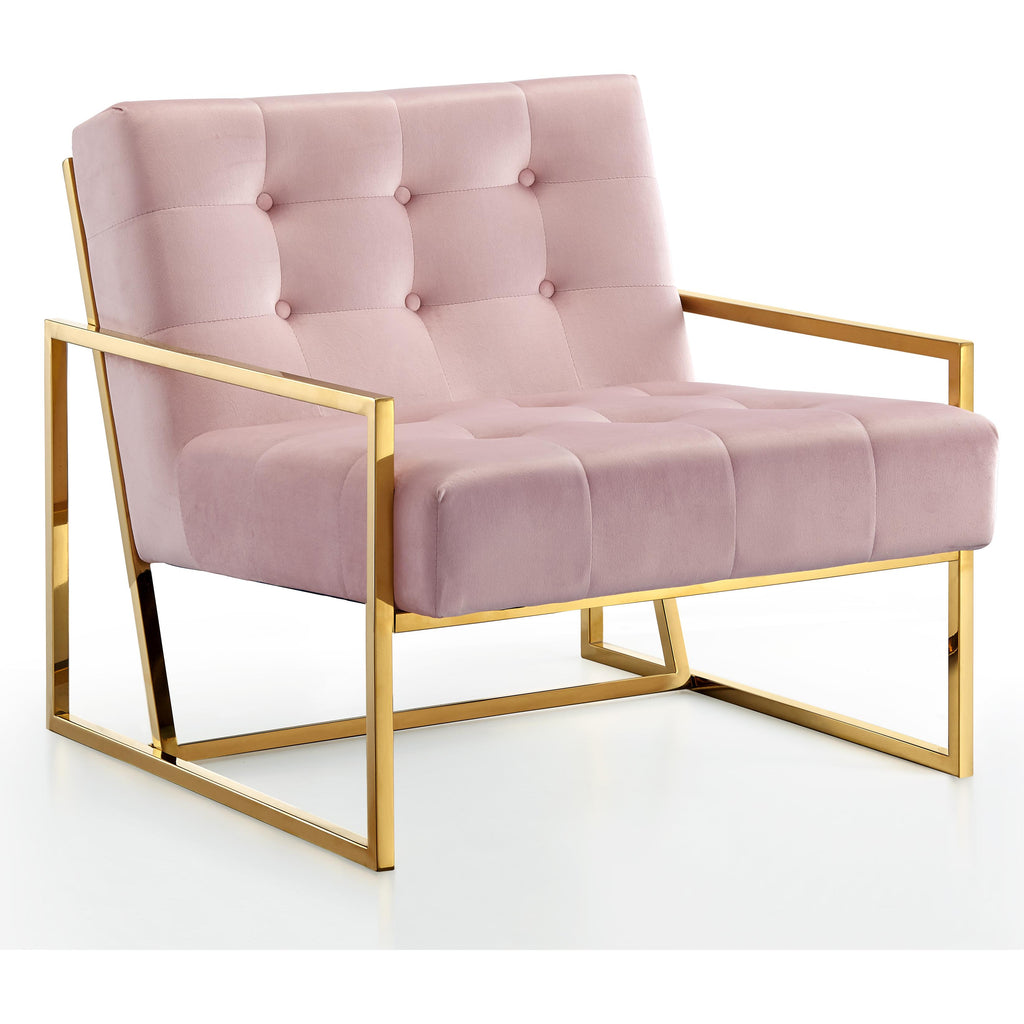 Give your room a touch of elegance and refinement with this ultra modern Pierre pink velvet accent chair. The base is made from stainless steel, so it's durably tough and strong enough to withstand heavy daily use. The base is finished in a gold tone hue, adding to its luxurious feel. Tufting on the thick back and seat cushions add to their durability and give it a welcoming look.