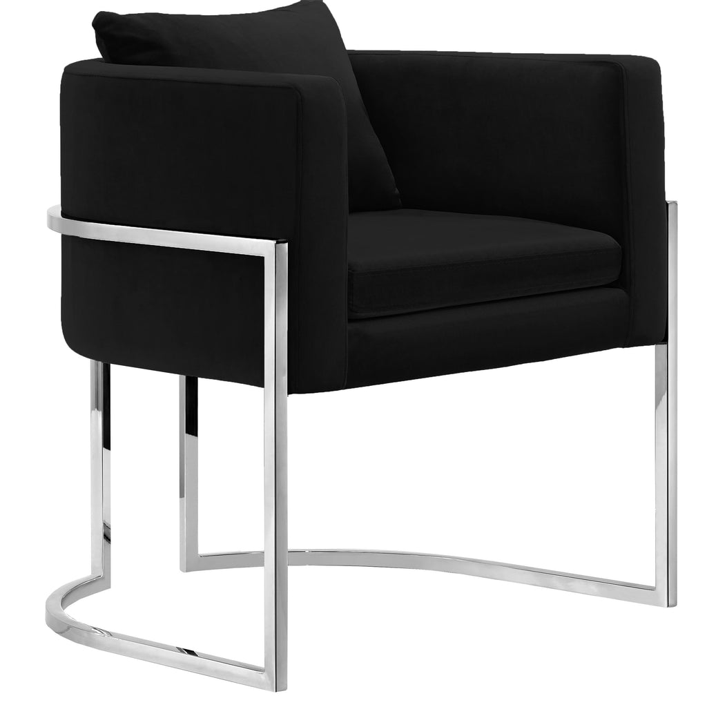 Make your living quarters stand out with this unique black velvet Pippa accent chair that conveys your own special flare. Its stocky curved back is upholstered with plush black velvet, providing you with a soft, comfortable place to rest while sitting and drinking coffee or reading a book after a long day. Rich chrome stainless steel legs give this chair a contemporary design that is sure to stand out among your existing modern decor.