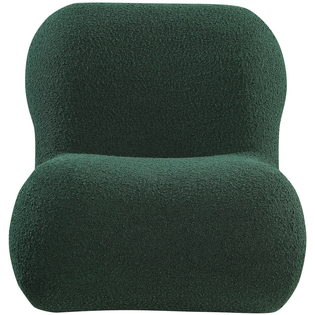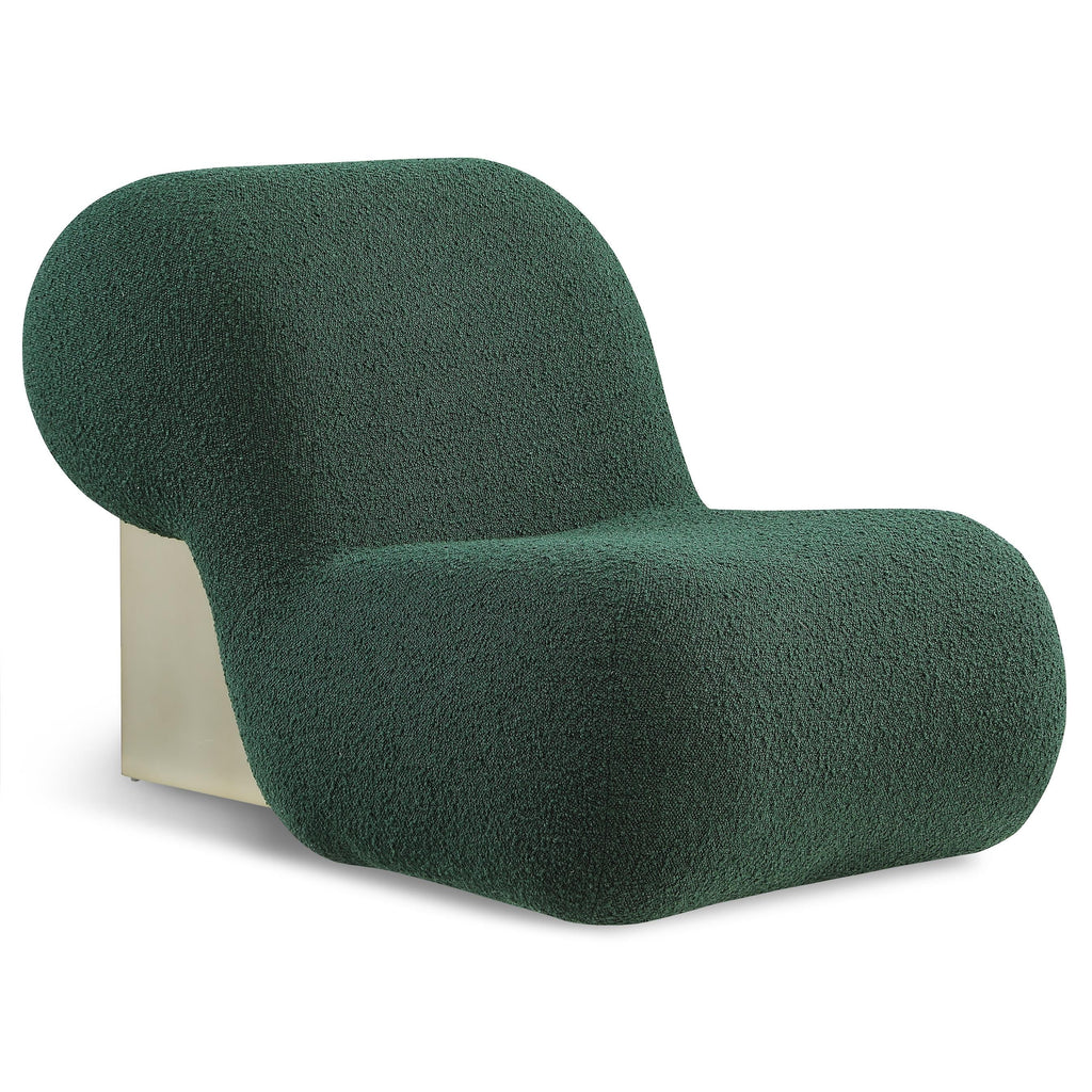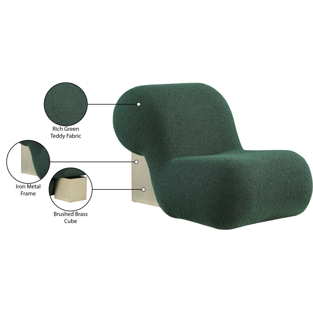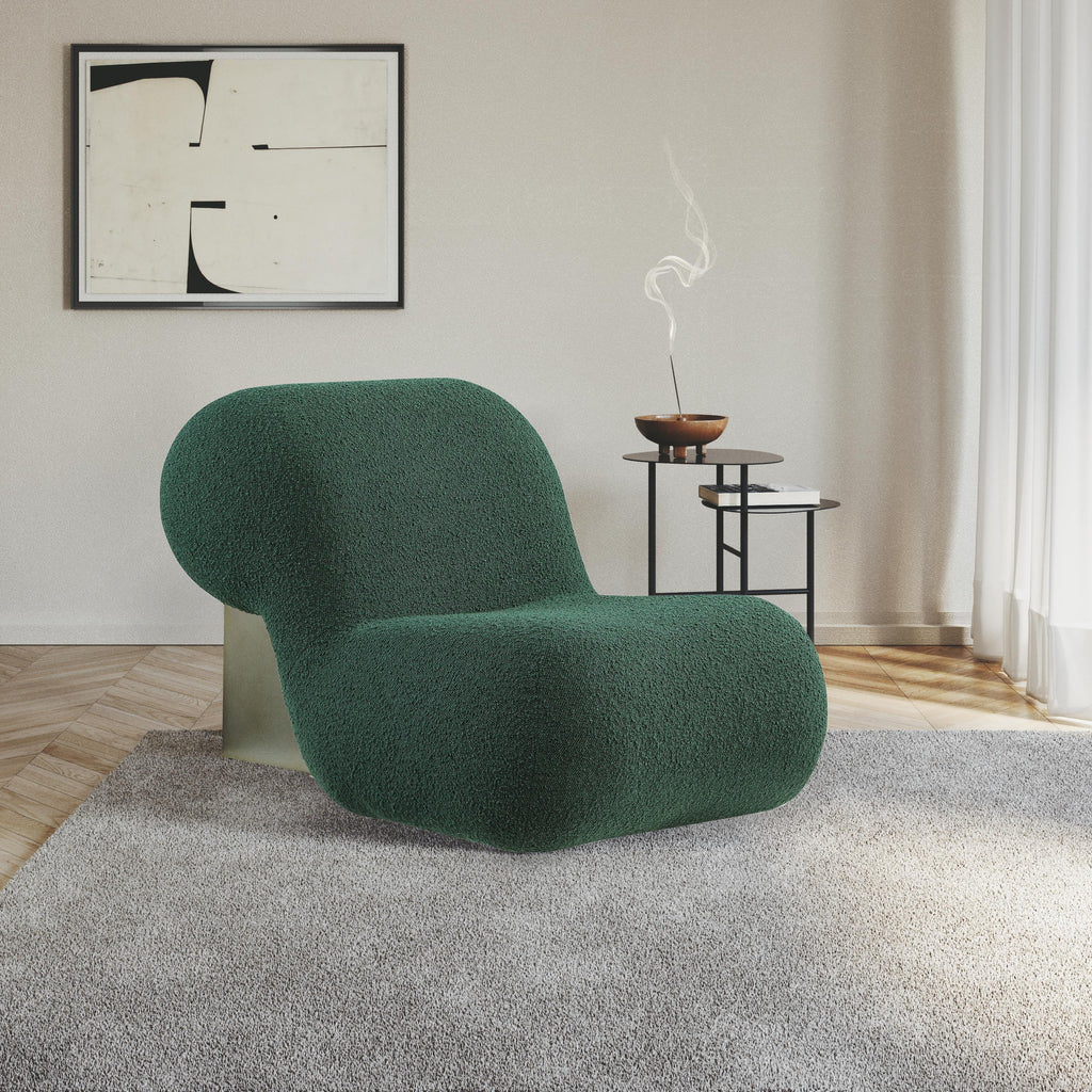 Lounge the day away from the comfort of this green Quadra boucle fabric accent chair. Perfect to set a casual vibe in any room, this accent chair offers a slanted back to help you position yourself comfortably for an evening of binge watching your favorite programs. An iron metal frame ensures long-lasting performance, while a rich green teddy fabric upholstery adds welcoming softness.