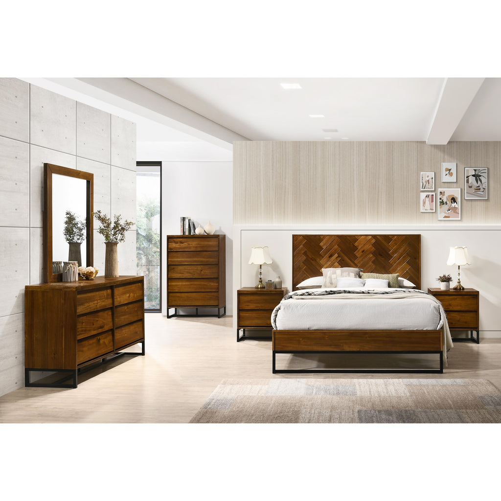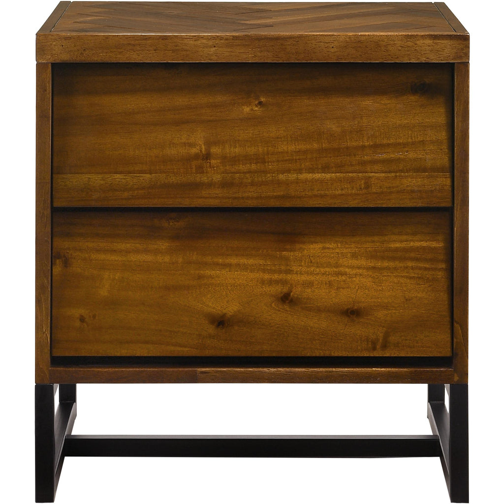 Create a distinctly contemporary vibe in your bedroom sanctuary with this antique coffee Reed nightstand from the Reed Wood collection. This handsome night stand offers lots of room for holding folded apparel, and it rests on a metal base in sleek black matte for a modern touch. The hardware-free drawers lend to the chic, sophisticated and minimalist design of this nightstand, which features ample room on top for displaying framed photos or keepsakes.