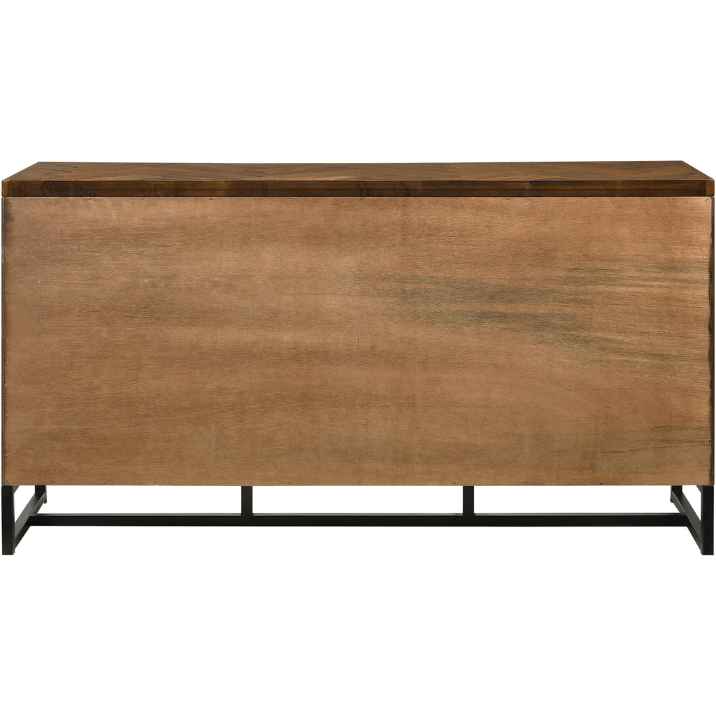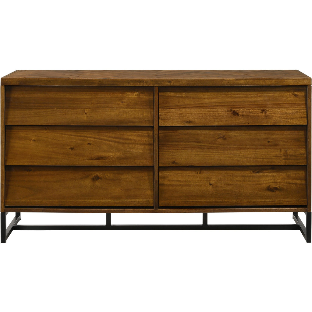 Create a distinctly contemporary vibe in your bedroom sanctuary with this antique coffee Reed dresser from the Reed Wood collection. This handsome dresser offers lots of room for holding folded apparel, and it rests on a metal base in sleek black matte for a modern touch. The hardware-free drawers lend to the chic, sophisticated and minimalist design of this dresser, which features ample room on top for displaying framed photos or keepsakes.