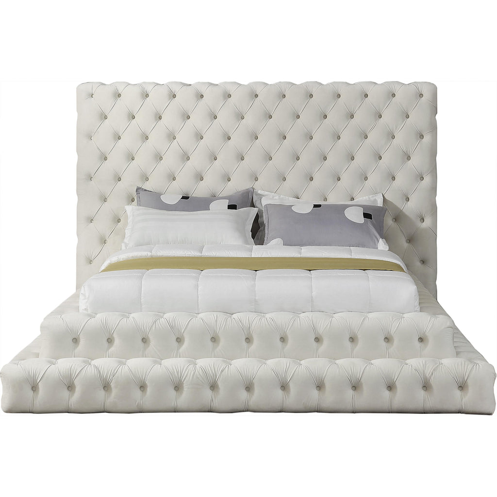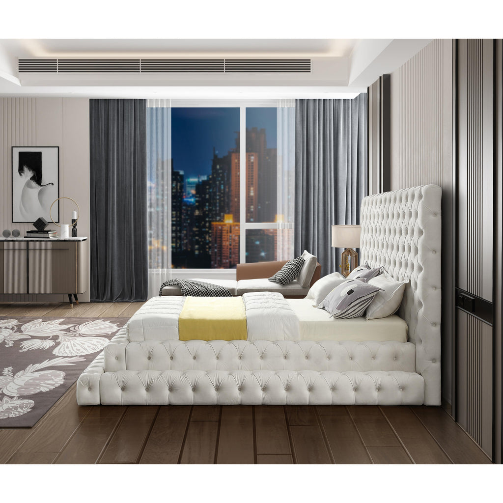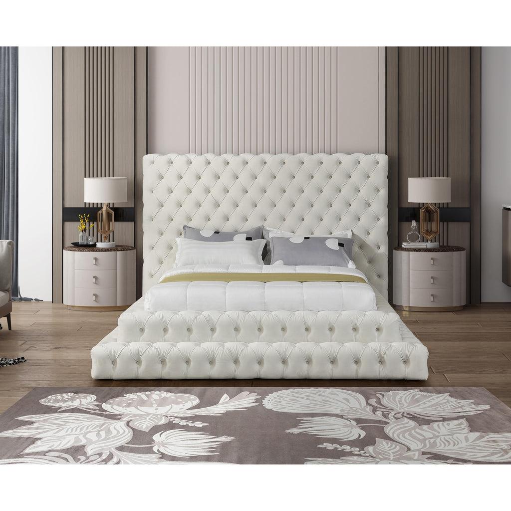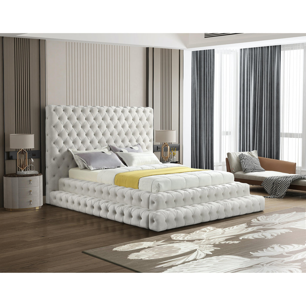 Feel like royalty when you lie down in this Revel velvet bed. This queen-size bed features soft cream velvet that covers every square inch, leaving behind a silky trail of beauty. The true star of the show is the deep button tufted design and extra-tall headboard, both of which serve to make this a bed fit for a queen (or king). A staggered, layered design adds to the bed's dramatic look in your room.
