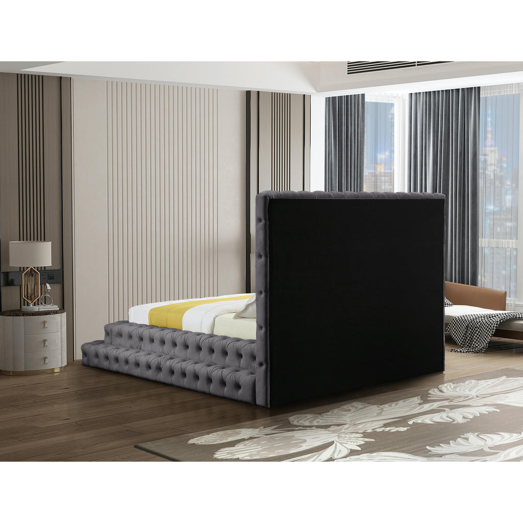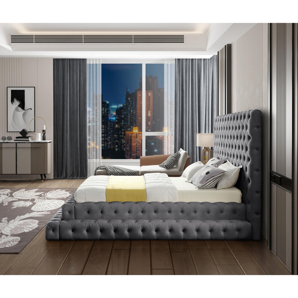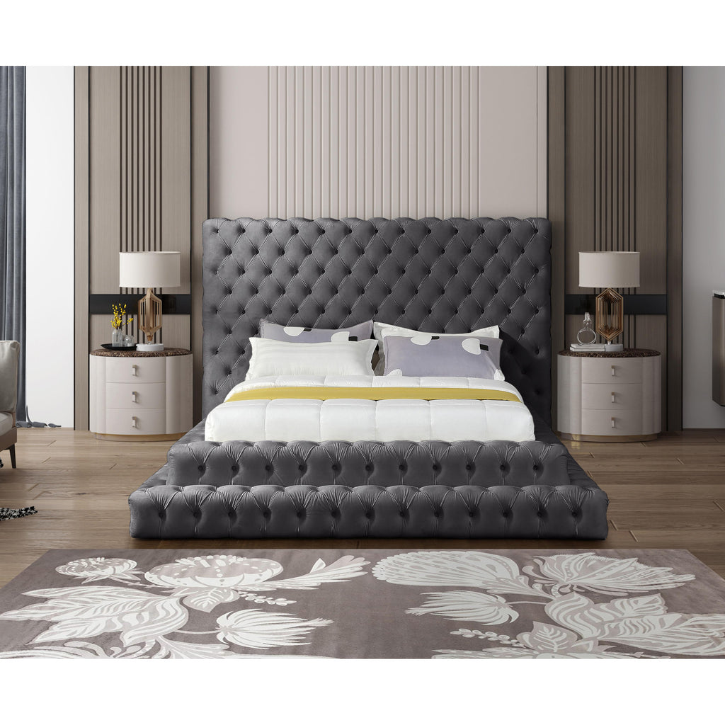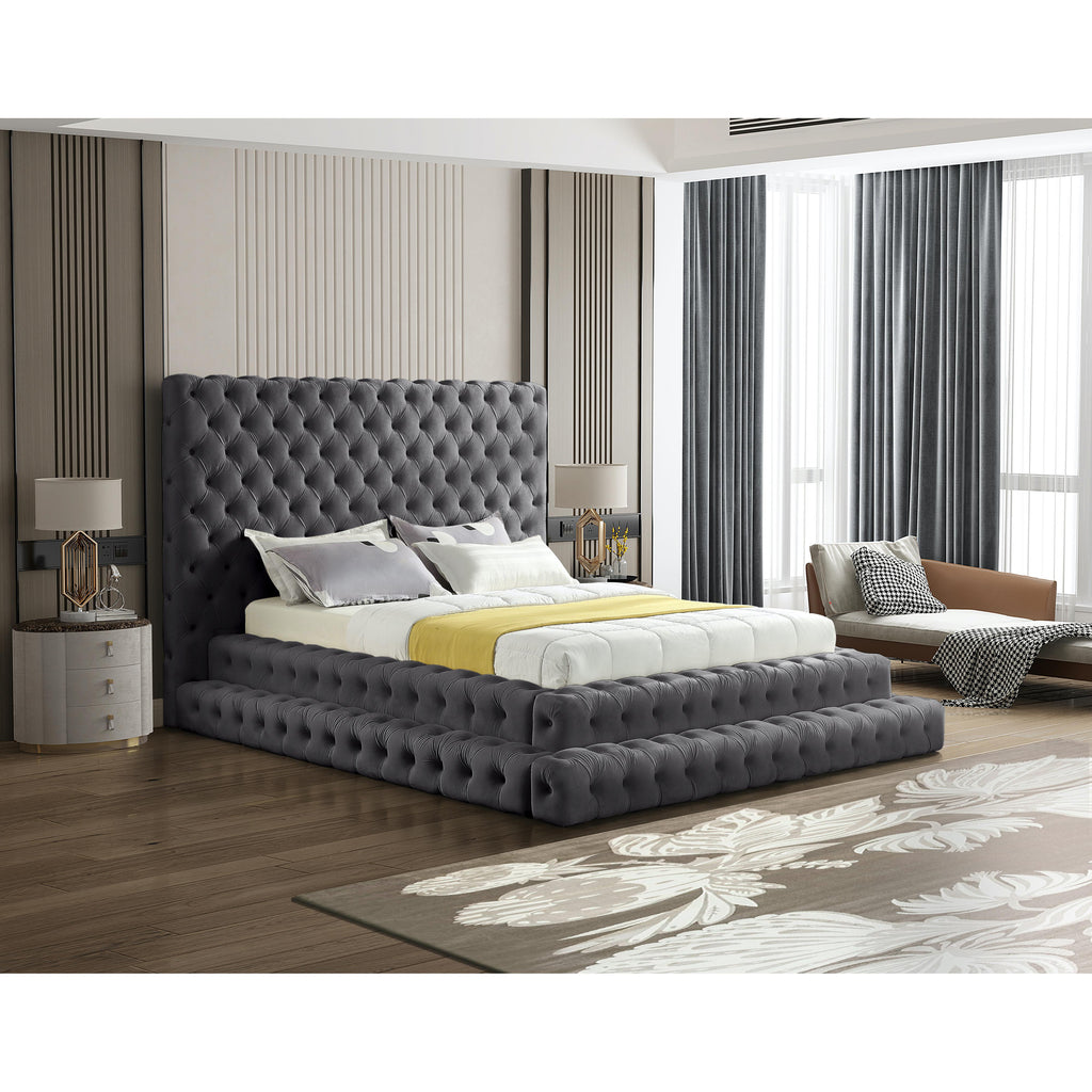 Feel like royalty when you lie down in this Revel velvet bed. This queen-size bed features soft grey velvet that covers every square inch, leaving behind a silky trail of beauty. The true star of the show is the deep button tufted design and extra-tall headboard, both of which serve to make this a bed fit for a queen (or king). A staggered, layered design adds to the bed's dramatic look in your room.