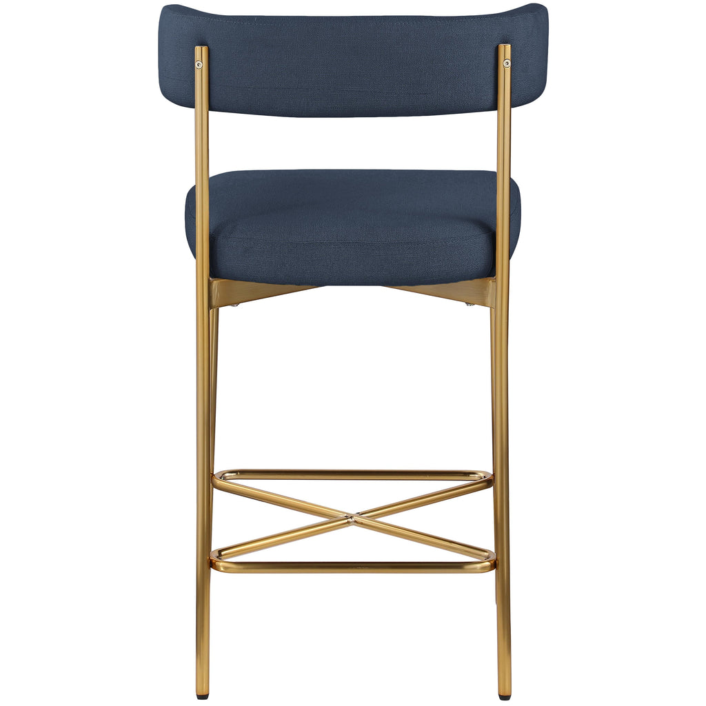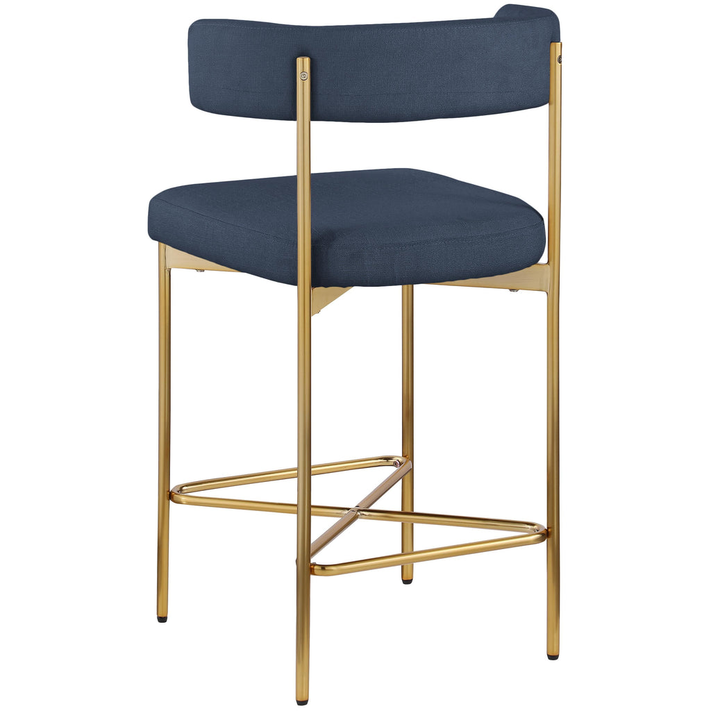 Bring a simple yet elegant touch to your dining area or bar with these Rivage Linen Textured Fabric Bar / Counter Stools. These stools are upholstered in a luxurious, deep navy linen-textured fabric that is not only durable but also adds a touch of elegance to any space. The brushed gold metal frame adds to the stools' longevity and makes them a timeless addition to your home. With a perfectly curved back, these stools provide ultimate comfort that will allow you to sit and enjoy your meals or drinks with ease.