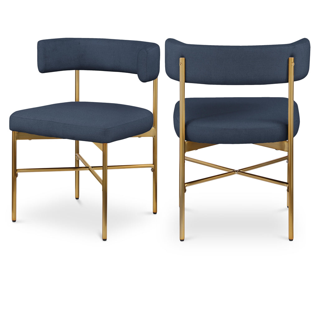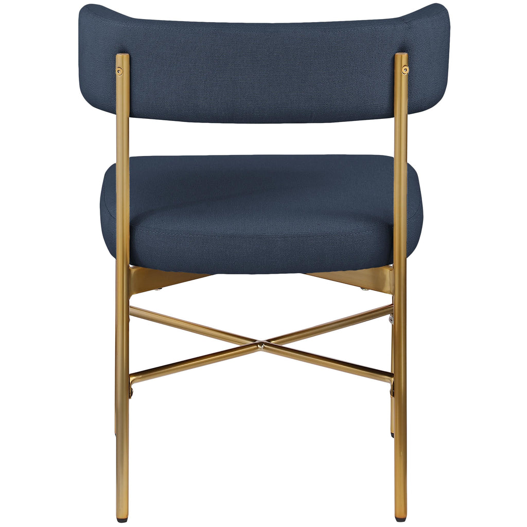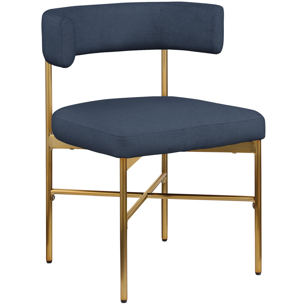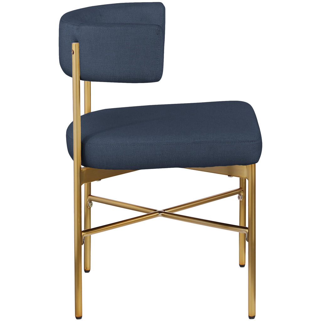 Dine in style when you add this Rivage linen textured fabric dining chair to your space. This lovely chair features rich navy durable linen textured fabric upholstery on the curved seat back and seat, giving your space an elegant and refined feel. An all-metal frame adds a durable slant to the design while a brushed gold finish gives the chair just a hint of refinement and sophistication.