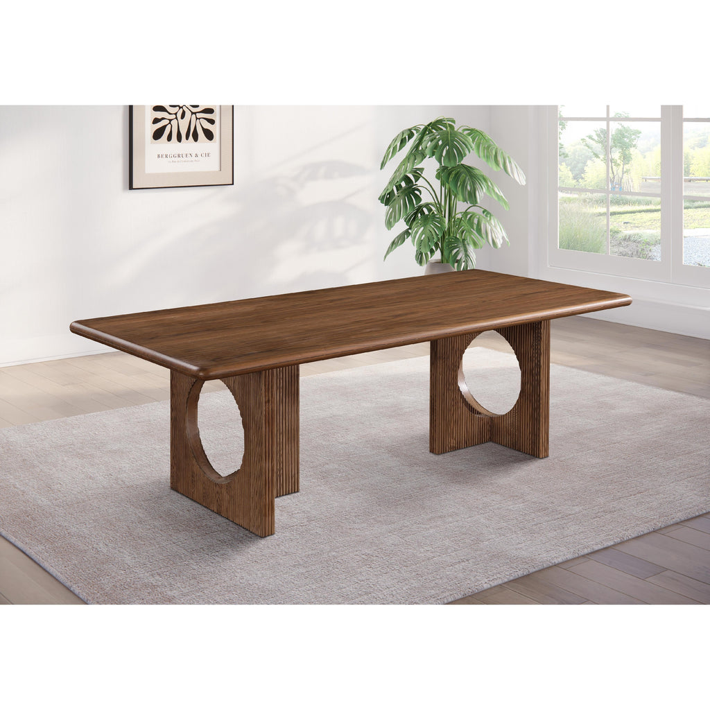 The Rivas Dining Table is a stunning piece of furniture that brings together the classic beauty of mid-century design and the sleek modern look. Crafted with ash veneer, this rectangular table boasts a rich walnut finish that is both elegant and durable. The fluted base is a unique feature that adds an element of distinction, making it a perfect addition to any room. Its eye-catching design is sure to draw attention and make a statement in your home.