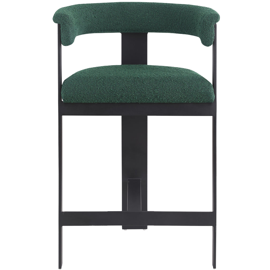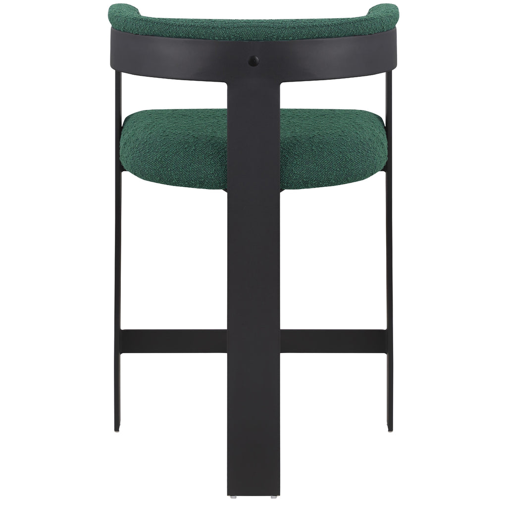 Update your kitchen counter or home bar with this green Romeo boucle stool. It boasts a soft green boucle seat and a curved back for comfortable and contemporary seating. The matte black metal frame ensures sturdiness and a sleek aesthetic, impressing family and guests alike. With its modern design, this stool effortlessly complements your space, making it a superb addition to your space.