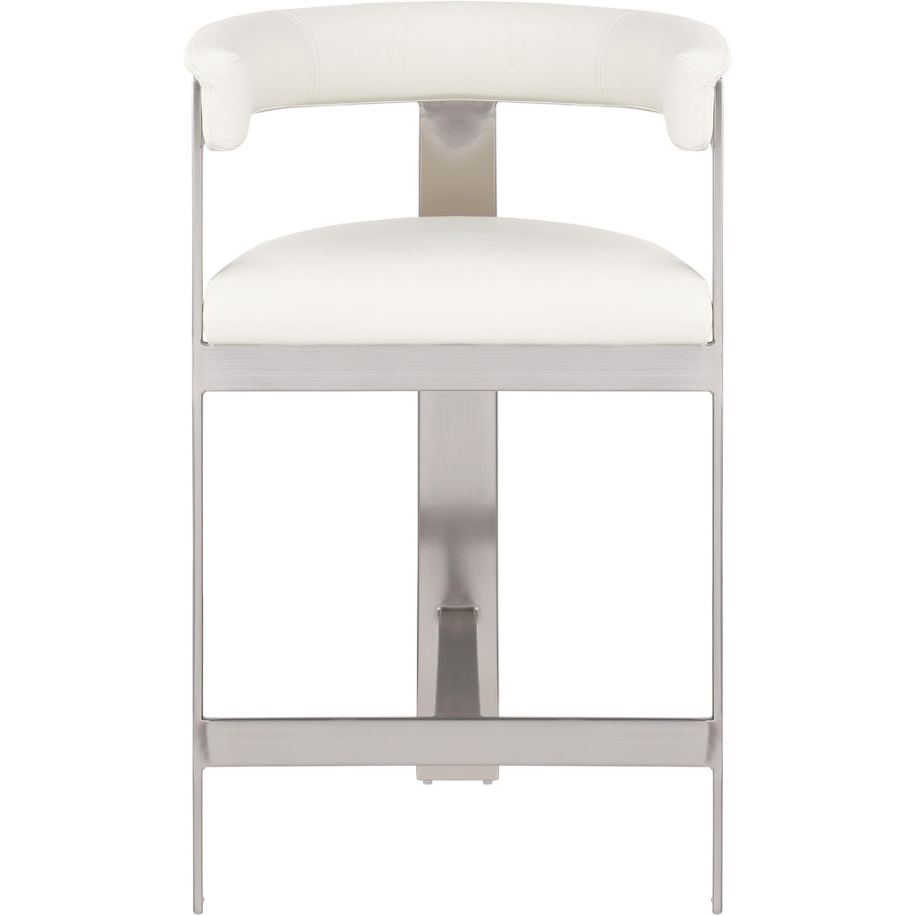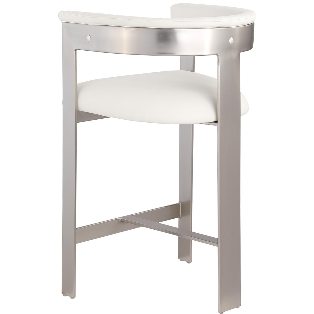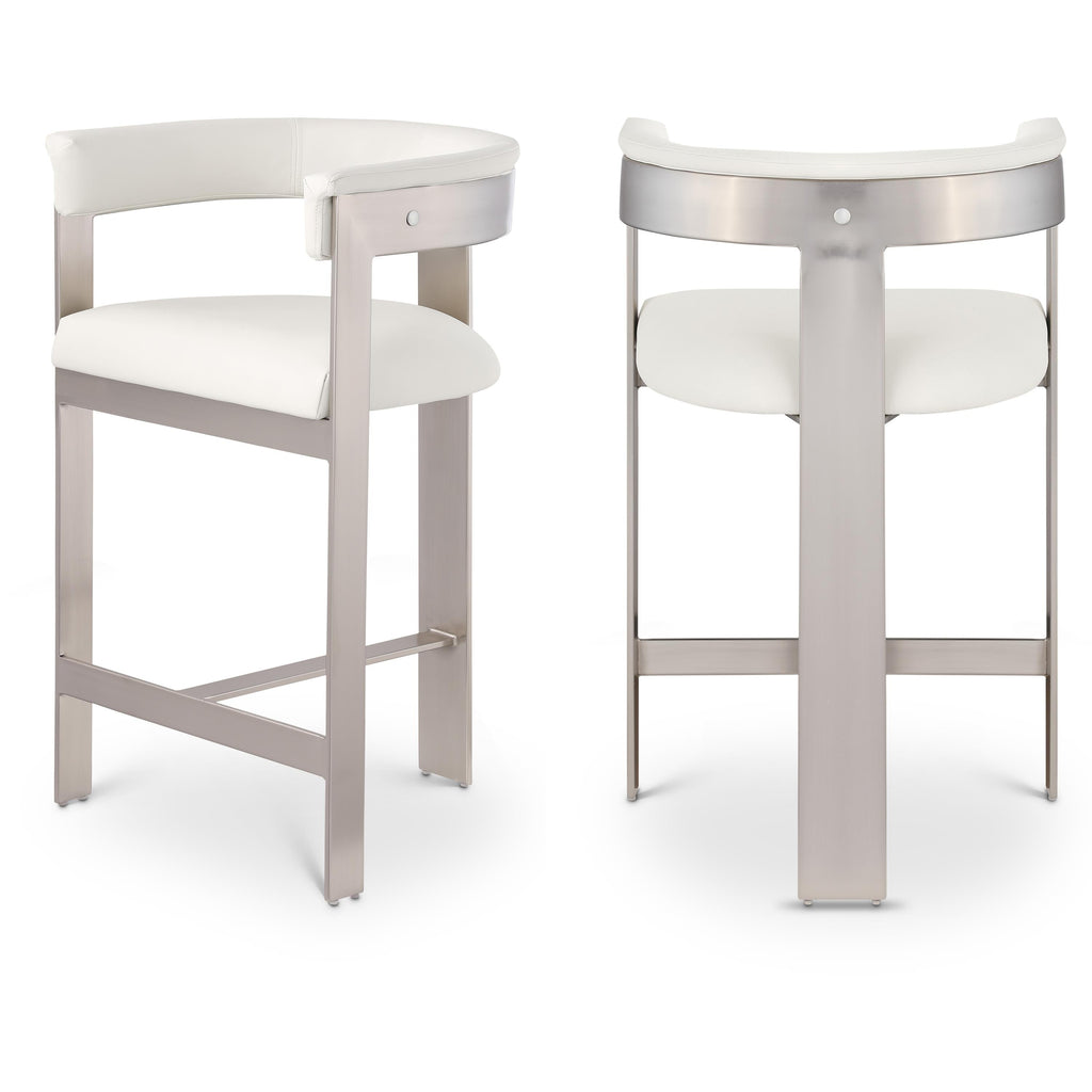 Enjoy an elevated dining experience when you bring home this cream Romeo vegan leather counter stool. Featuring seats and backs upholstered in soft cream vegan leather fabric, this stool offers both style and comfort. The brushed chrome metal frames add a contemporary touch, making this stool a chic addition to your dining area. The curved backs provide not only a sleek look but also optimal support for the body, ensuring diners are relaxed from appetizers through dessert.