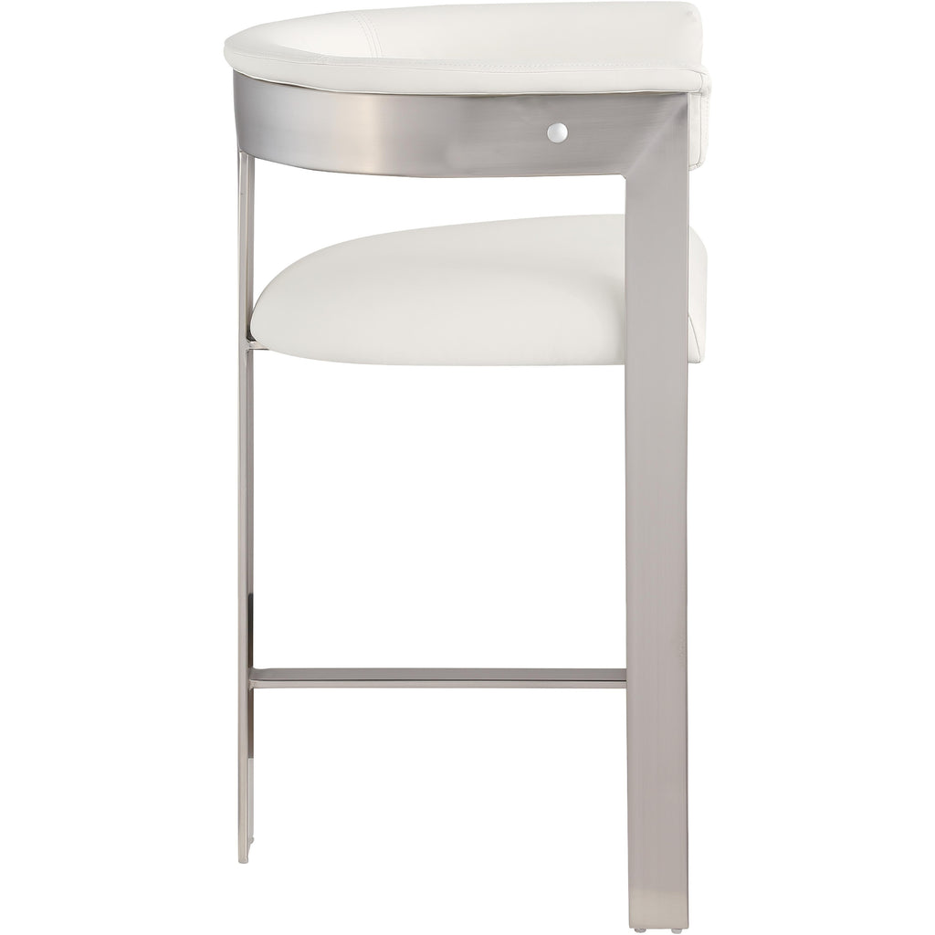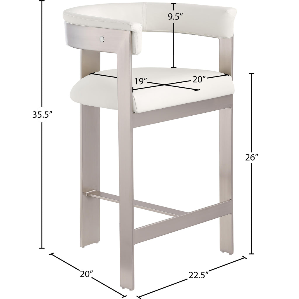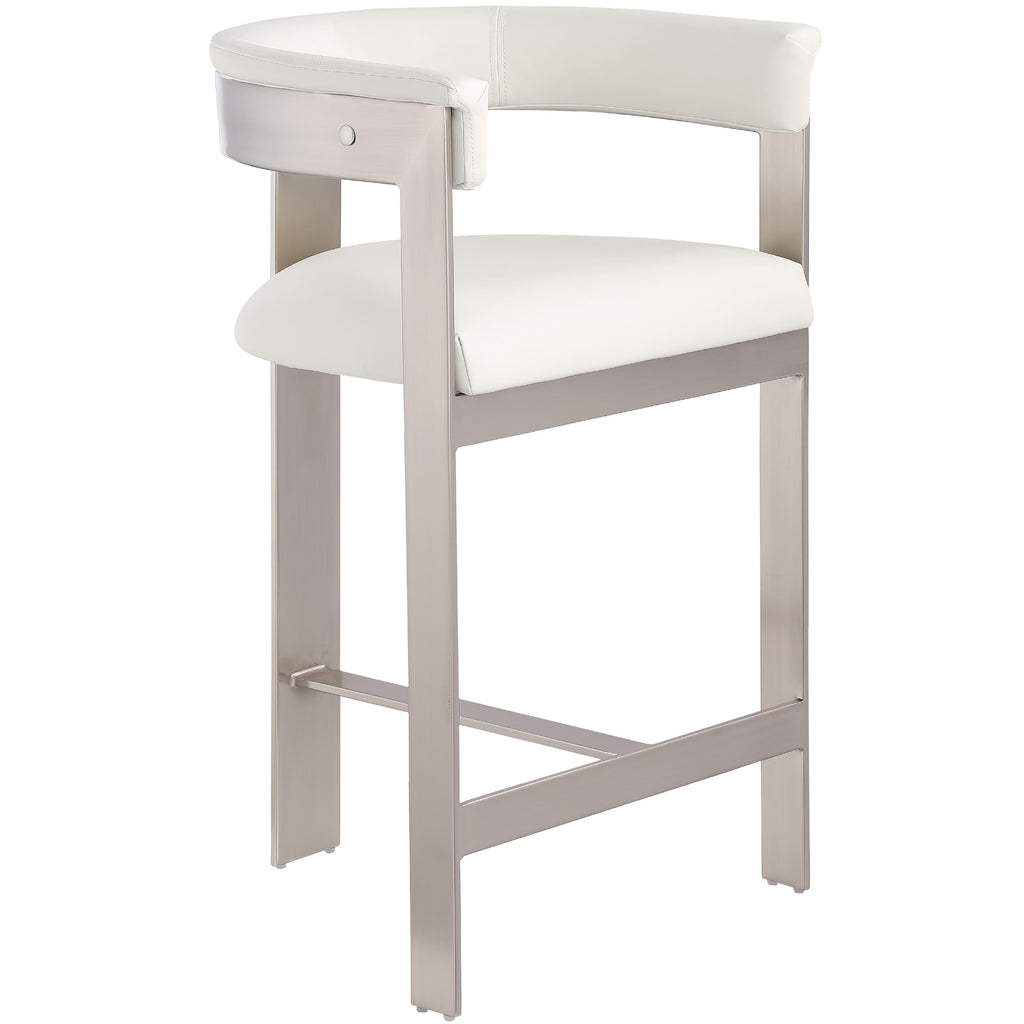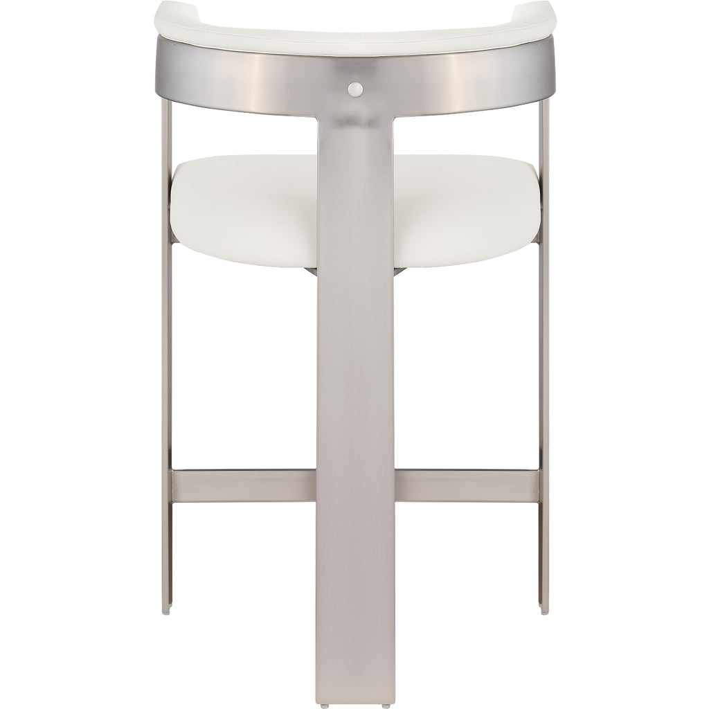 Enjoy an elevated dining experience when you bring home this cream Romeo vegan leather counter stool. Featuring seats and backs upholstered in soft cream vegan leather fabric, this stool offers both style and comfort. The brushed chrome metal frames add a contemporary touch, making this stool a chic addition to your dining area. The curved backs provide not only a sleek look but also optimal support for the body, ensuring diners are relaxed from appetizers through dessert.