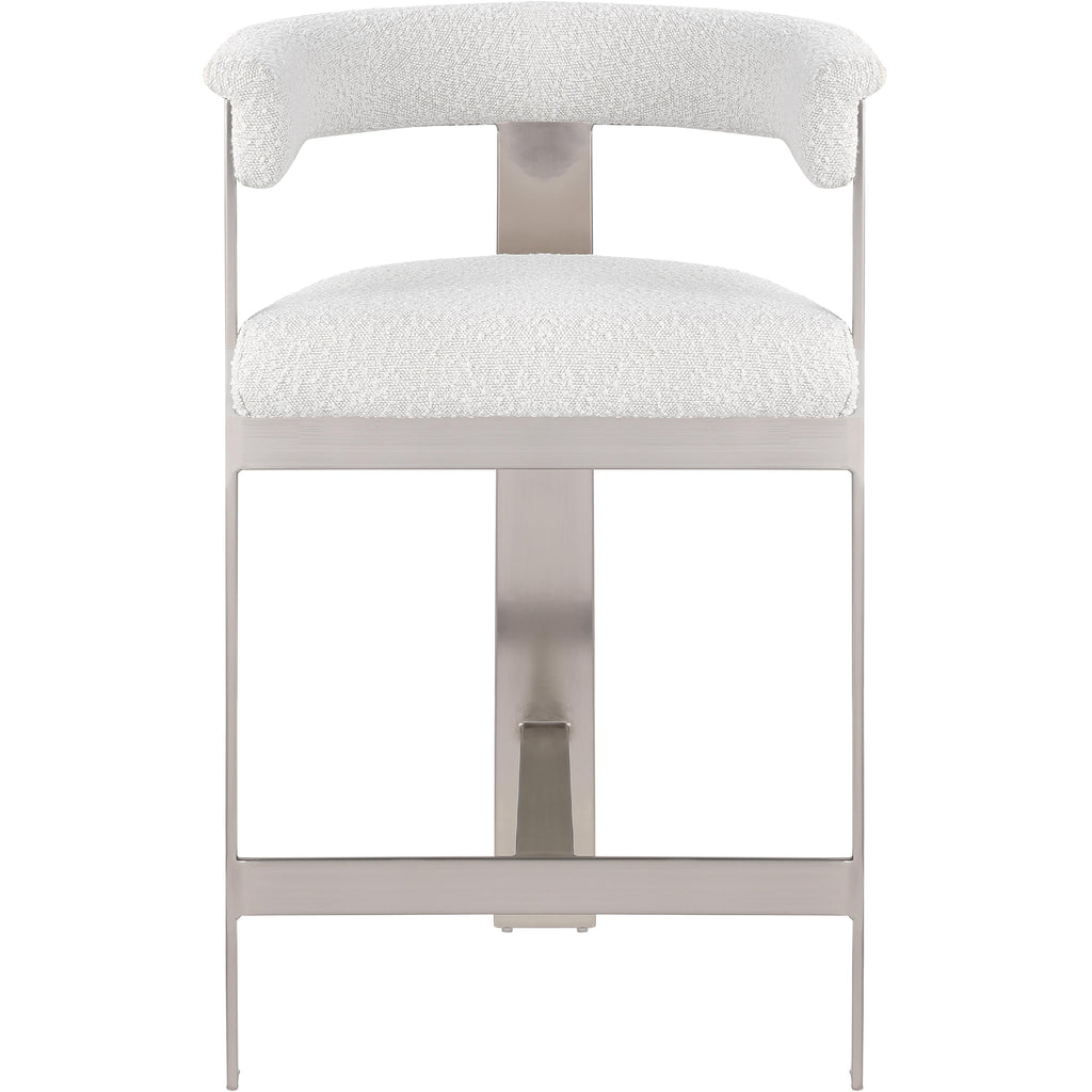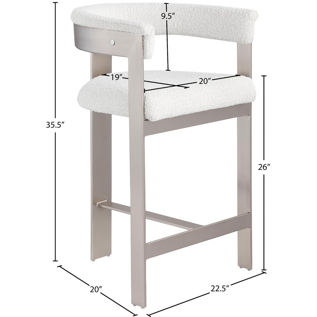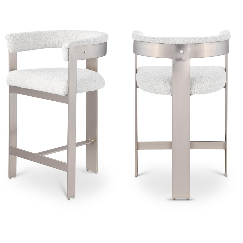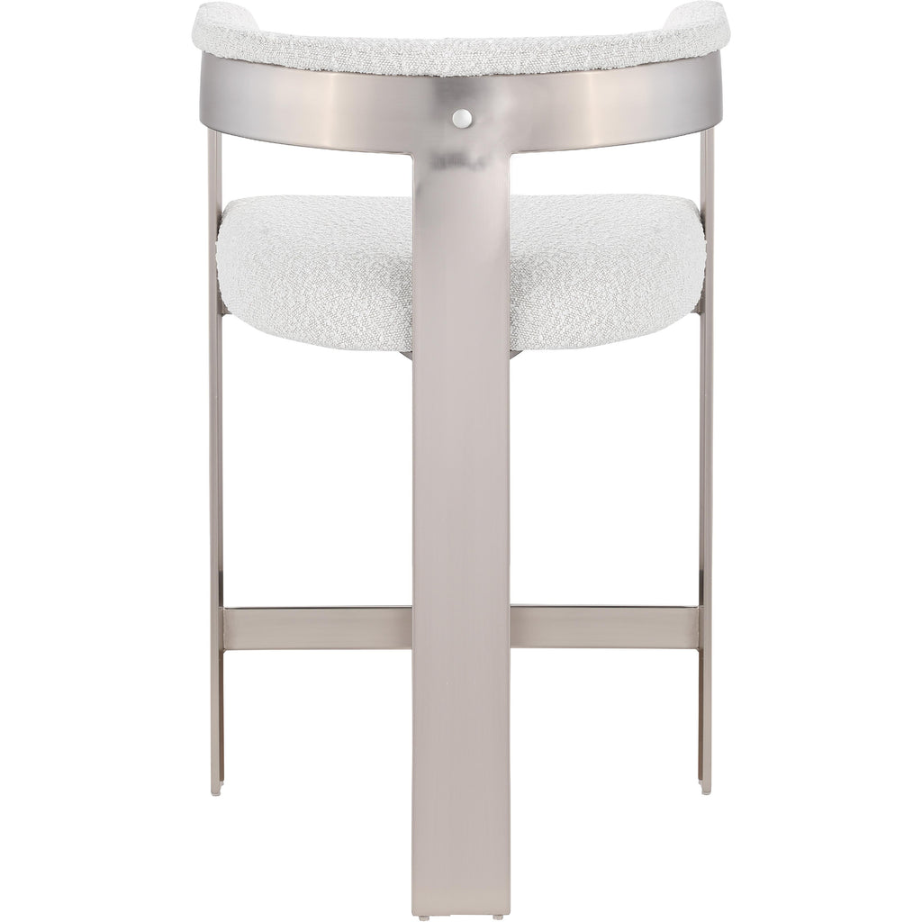 Enjoy an elevated dining experience when you bring home this cream Romeo boucle counter stool. Featuring seats and backs upholstered in soft cream boucle fabric, this stool offers both style and comfort. The brushed chrome metal frames add a contemporary touch, making this stool a chic addition to your dining area. The curved backs provide not only a sleek look but also optimal support for the body, ensuring diners are relaxed from appetizers through dessert.