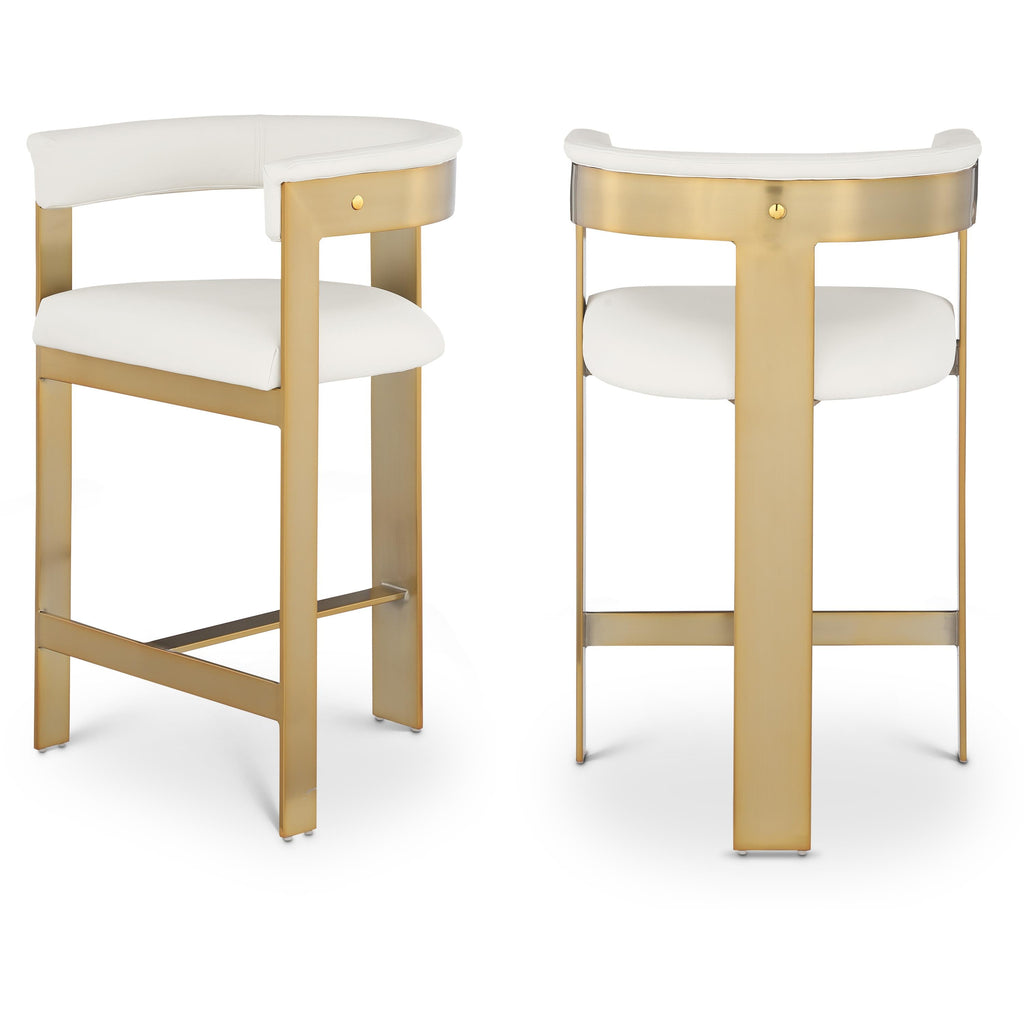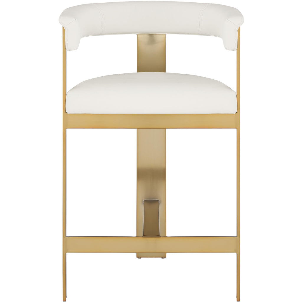 Choose these cream Romeo vegan leather stool to give your dining room an instant refresh. These stools feature cream vegan leather upholstered seats and backs, adding a modern touch to your space. The brushed gold metal frames offer an elegant contrast while ensuring durability. With sleek curved backs, these stools ensure comfort while enjoying a refreshing drink or meal. A cozy, chic seating solution for you and your guests, this stool will elevate any room's look.