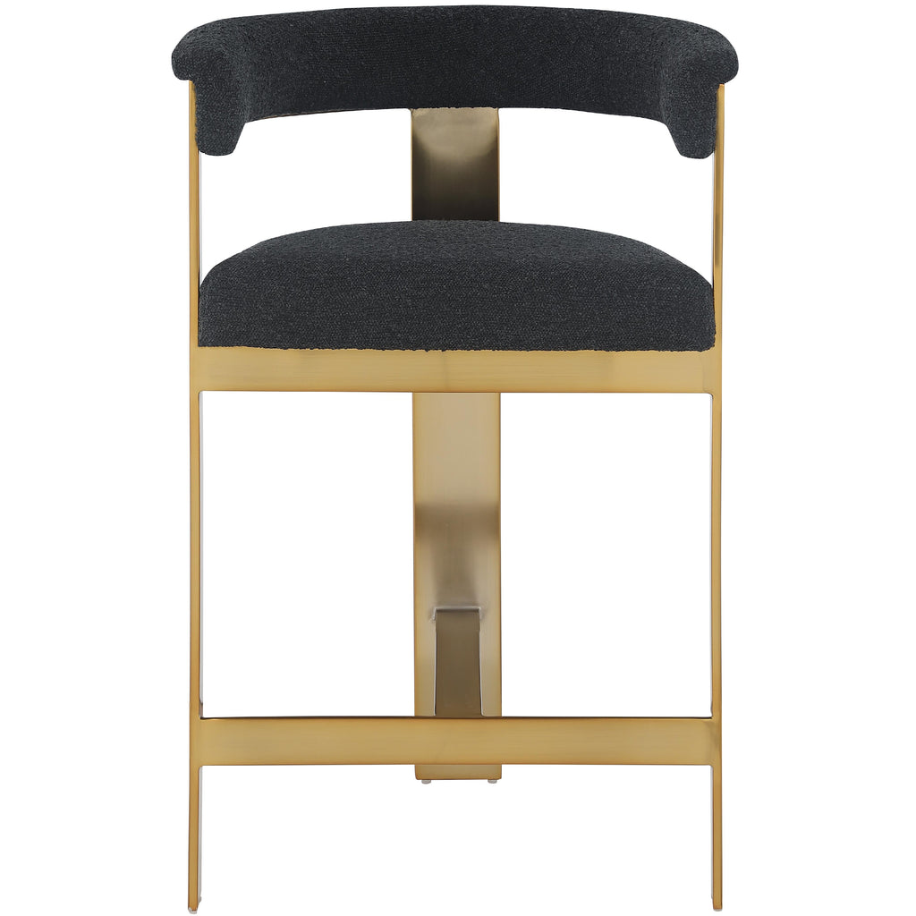 Choose these black Romeo boucle stool to give your dining room an instant refresh. These stools feature black boucle upholstered seats and backs, adding a modern touch to your space. The brushed gold metal frames offer an elegant contrast while ensuring durability. With sleek curved backs, these stools ensure comfort while enjoying a refreshing drink or meal. A cozy, chic seating solution for you and your guests, this stool will elevate any room's look.
