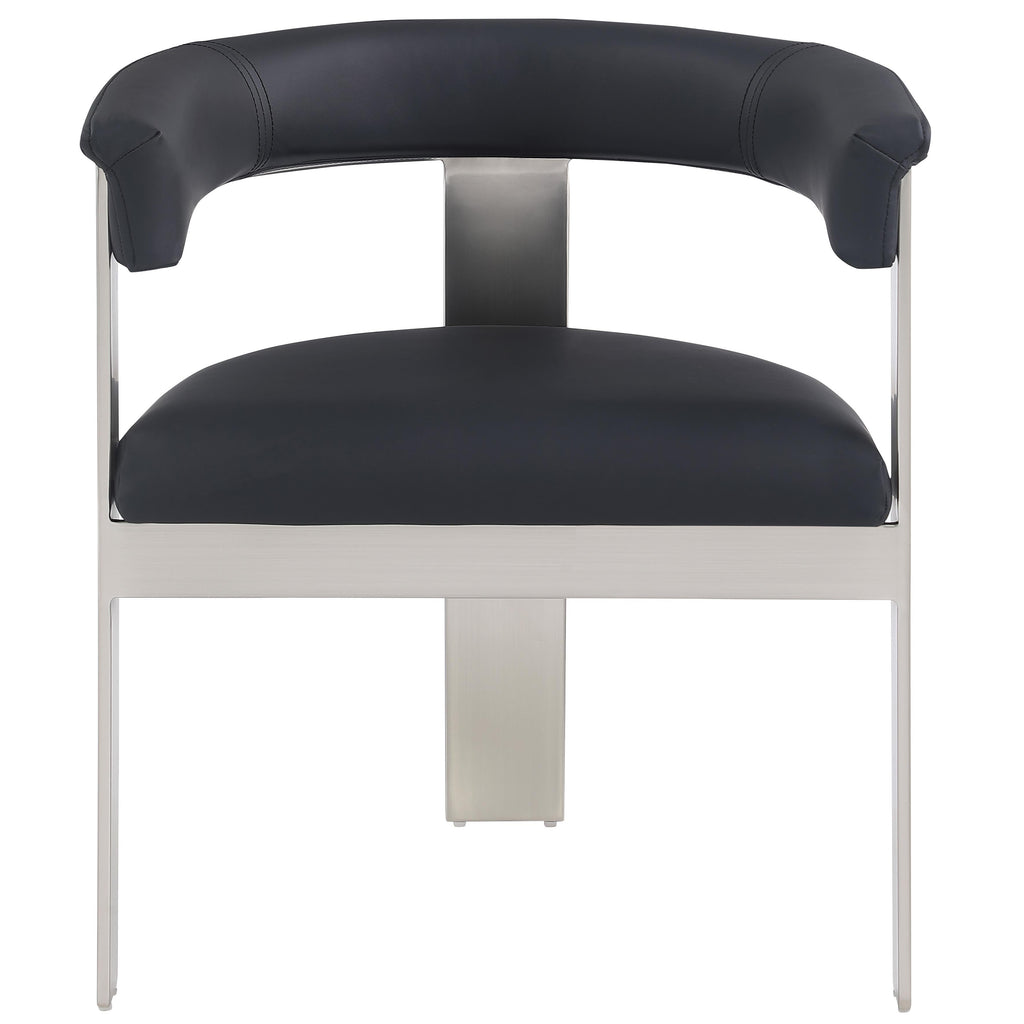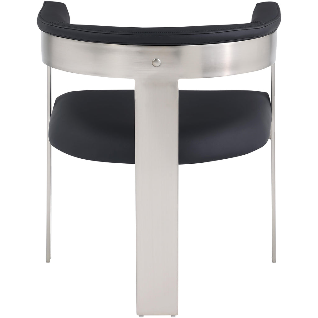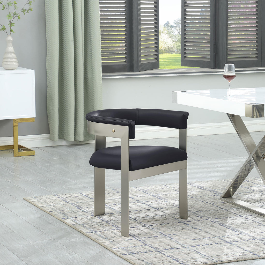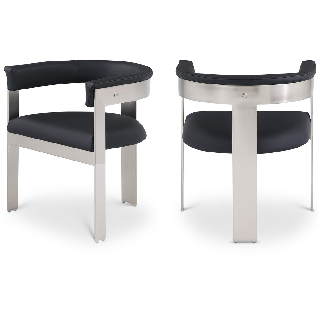 Enjoy an elevated dining experience when you bring home these black Romeo vegan leather dining chairs, sold as a set of two. Featuring seats and backs upholstered in soft black vegan leather, these chairs offer both style and comfort. The brushed chrome metal frames add a contemporary touch, making this pair of dining chairs a chic addition to your dining area. The curved backs provide not only a sleek look but also optimal support for the body, ensuring diners are relaxed from appetizers through dessert.