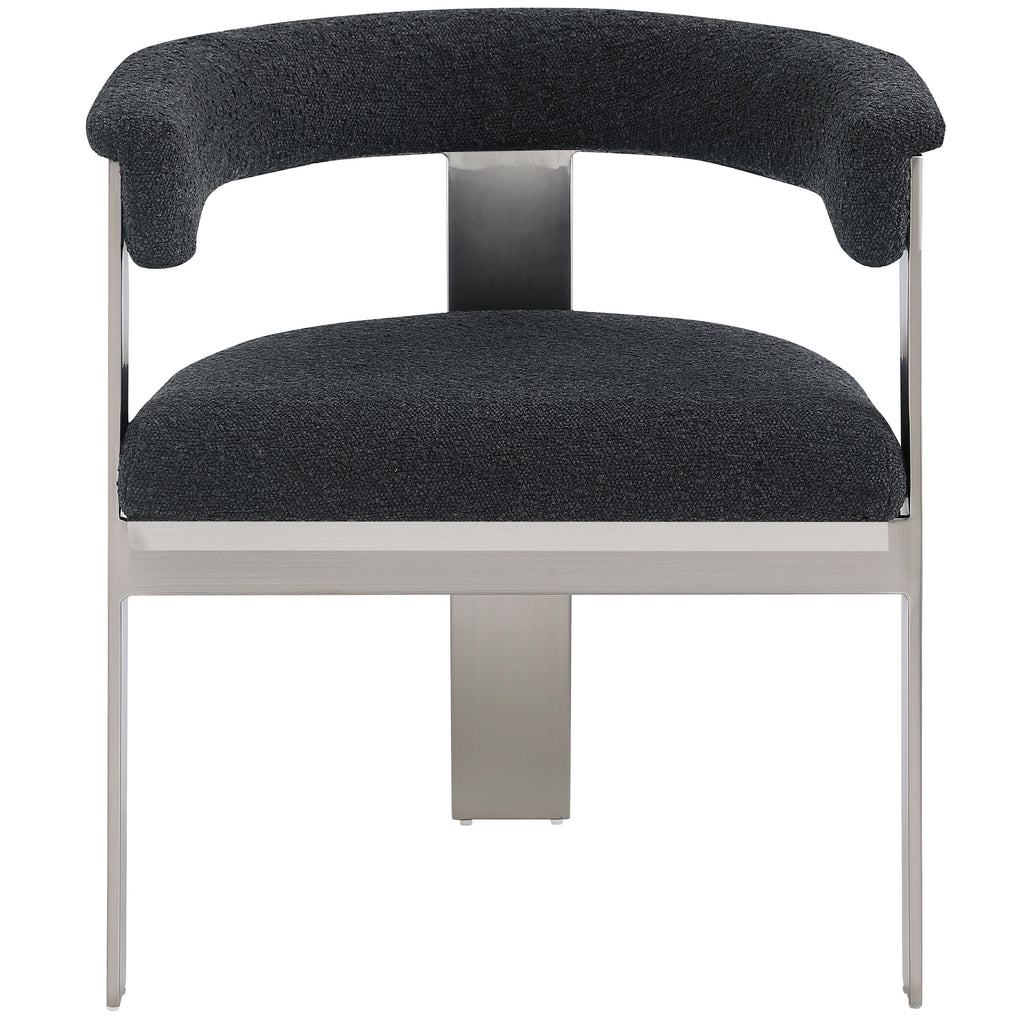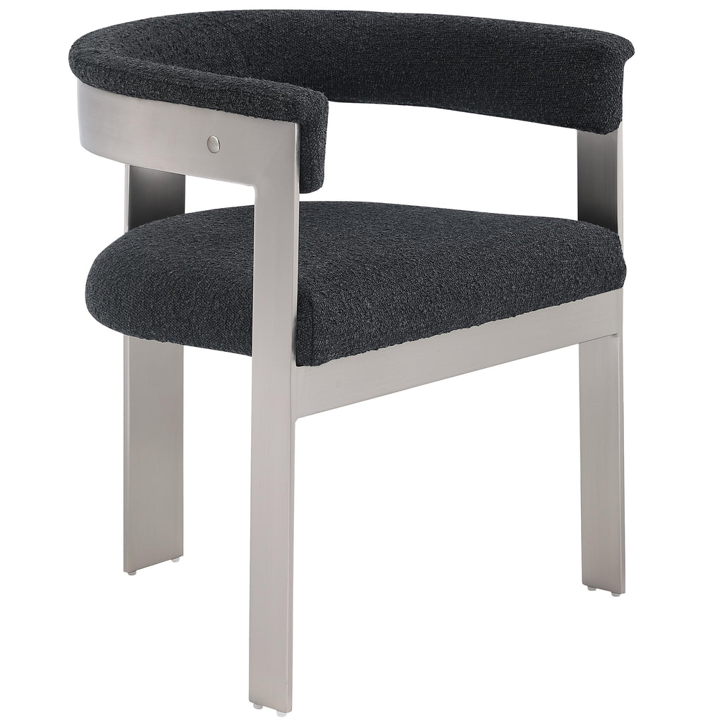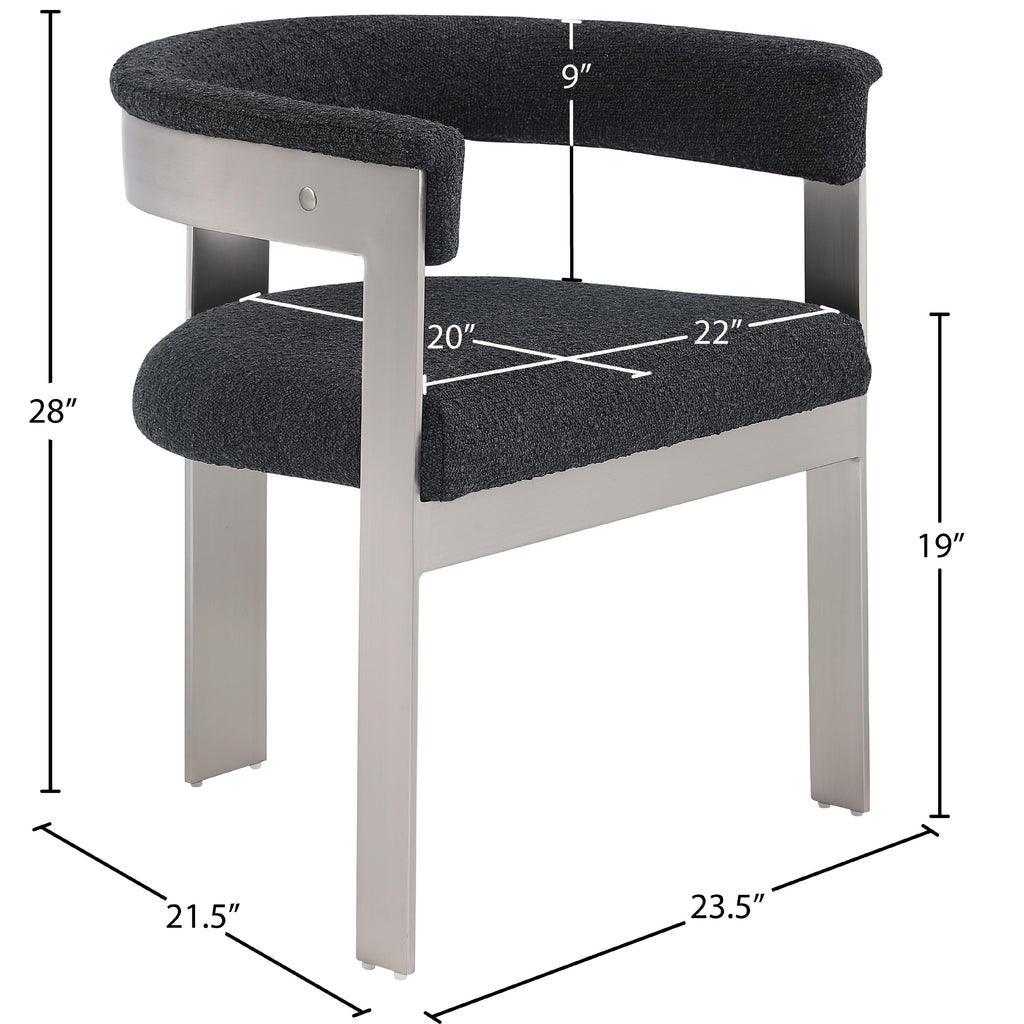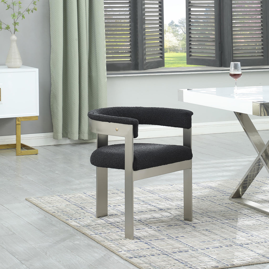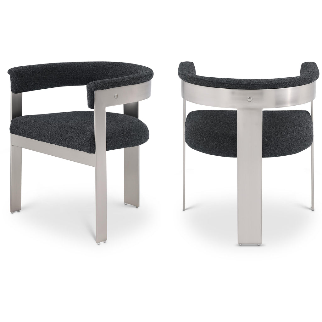 Enjoy an elevated dining experience when you bring home these black Romeo boucle dining chairs, sold as a set of two. Featuring seats and backs upholstered in soft black boucle fabric, these chairs offer both style and comfort. The brushed chrome metal frames add a contemporary touch, making this pair of dining chairs a chic addition to your dining area. The curved backs provide not only a sleek look but also optimal support for the body, ensuring diners are relaxed from appetizers through dessert.