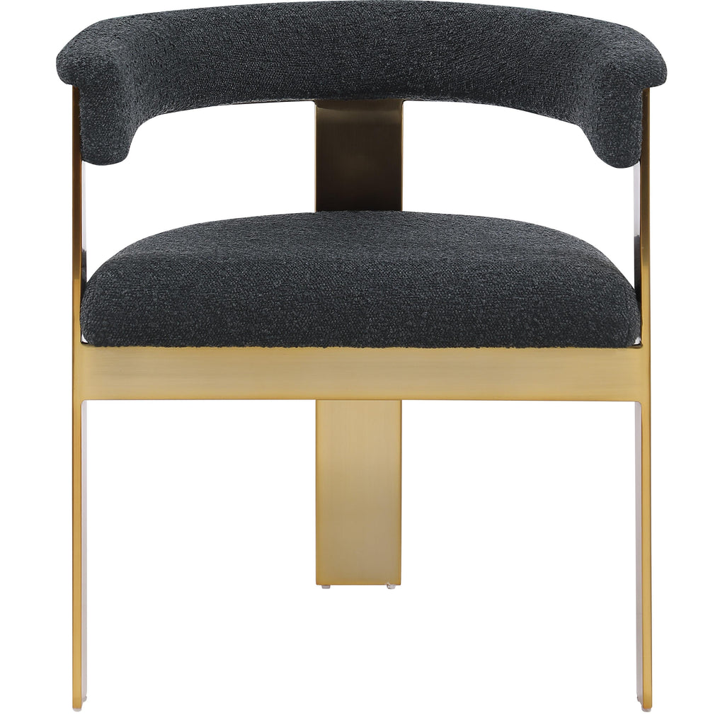 Choose these black Romeo boucle dining chairs to give your dining room an instant refresh. Packaged as a stylish set of two, these chairs feature black boucle upholstered seats and backs, adding a modern touch to your space. The brushed gold metal frames offer an elegant contrast while ensuring durability. With sleek curved backs, these chairs ensure diner's comfort from the meal's start to finish. A cozy, chic seating solution for you and your guests, this pair of dining chairs elevate your dining room's look while offering ample comfort from meal to meal.