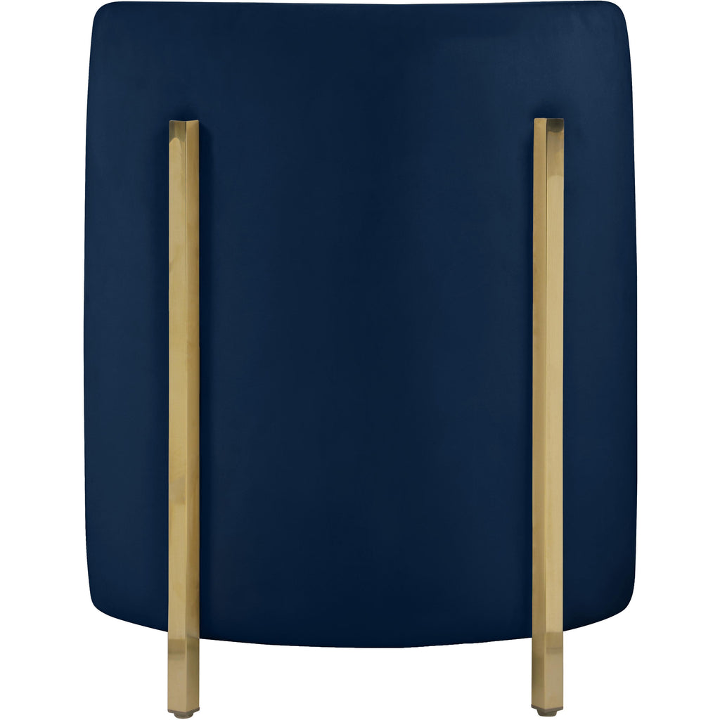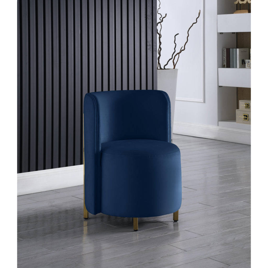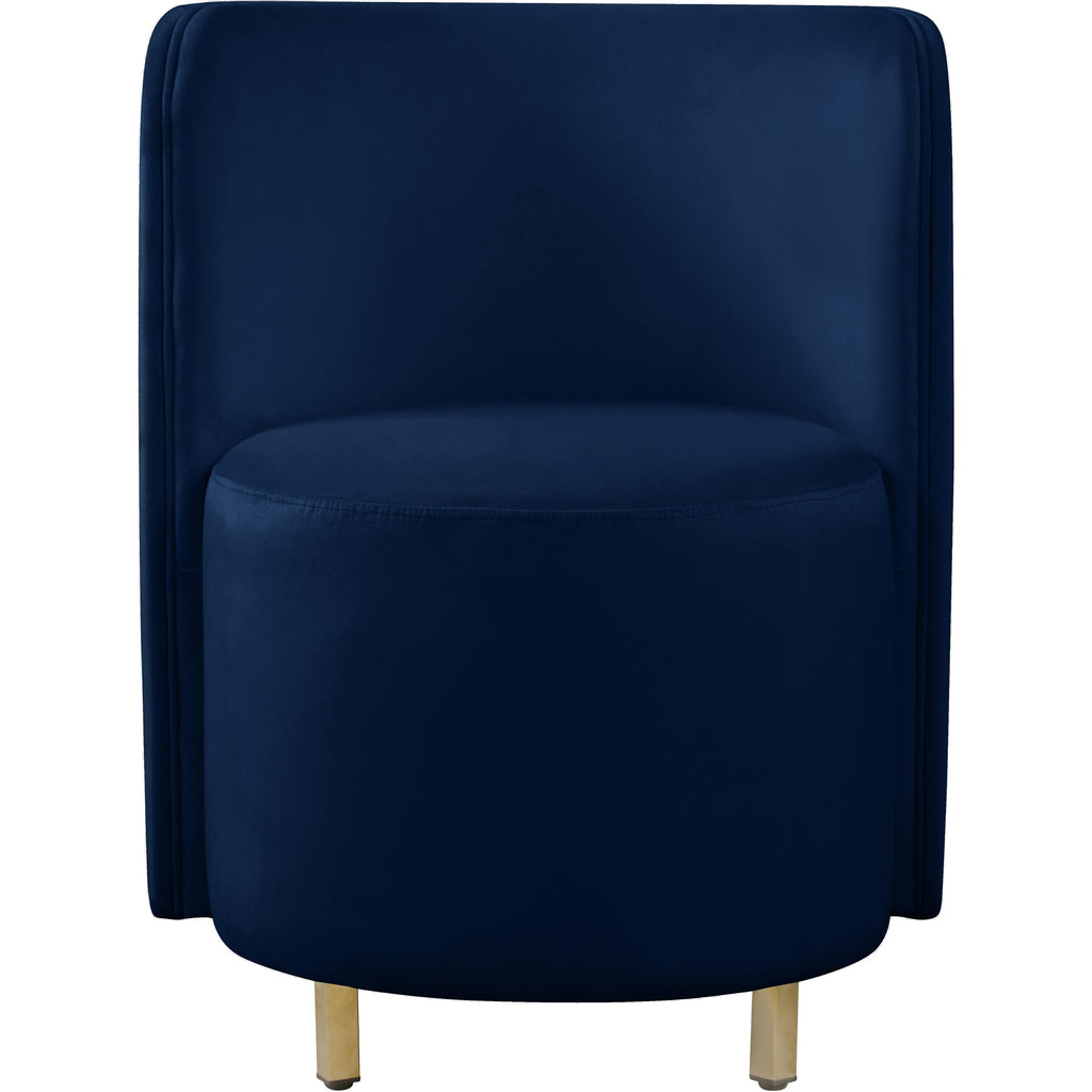 Create an envious look in your living room, parlor, bedroom or boudoir with this Rotunda velvet chair. This svelte little chair features a glamourous Hollywood vibe with its floor-length back and barrel design. The soft navy velvet upholstery lends it an added upscale feel, and the gold metal legs round out its contemporary panache. A wooden frame makes the chair a sturdy addition to any room.