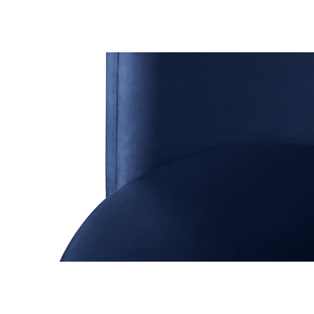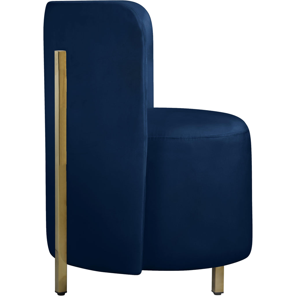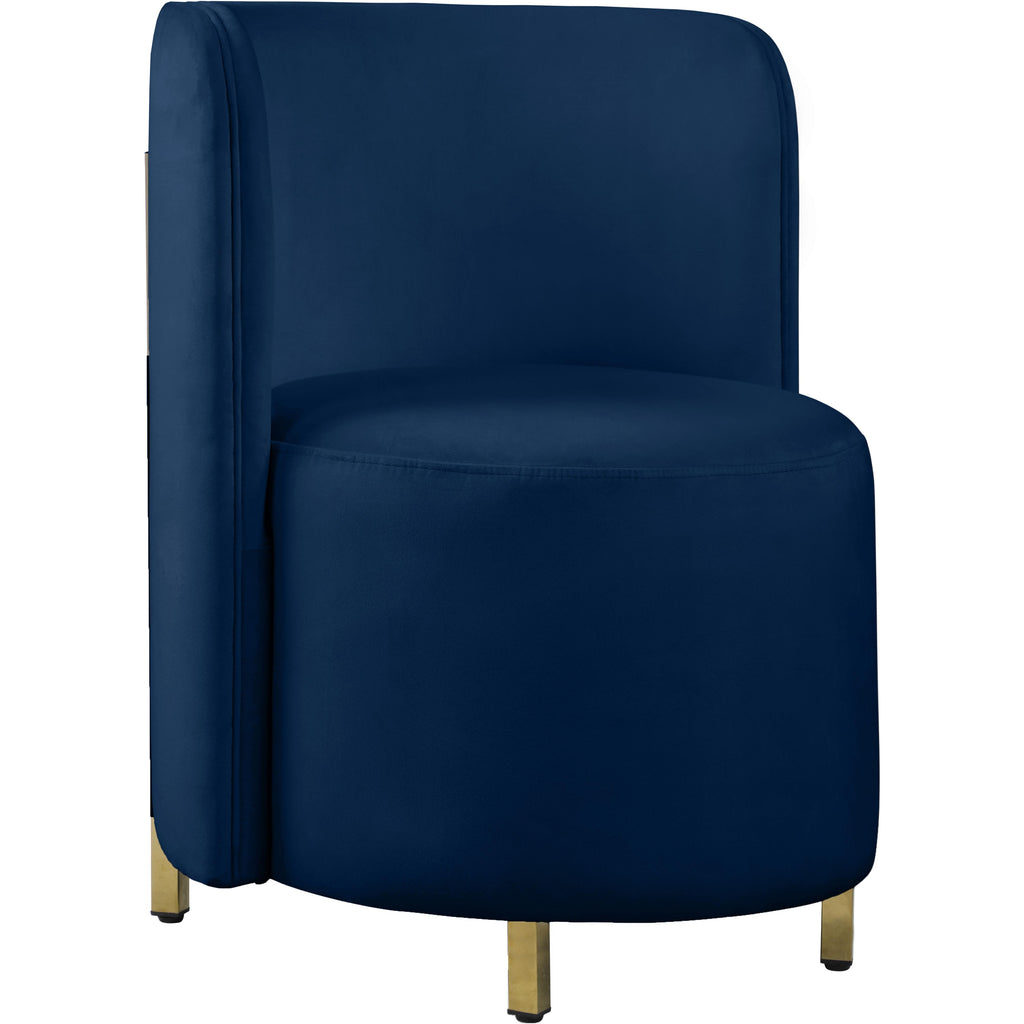 Create an envious look in your living room, parlor, bedroom or boudoir with this Rotunda velvet chair. This svelte little chair features a glamourous Hollywood vibe with its floor-length back and barrel design. The soft navy velvet upholstery lends it an added upscale feel, and the gold metal legs round out its contemporary panache. A wooden frame makes the chair a sturdy addition to any room.