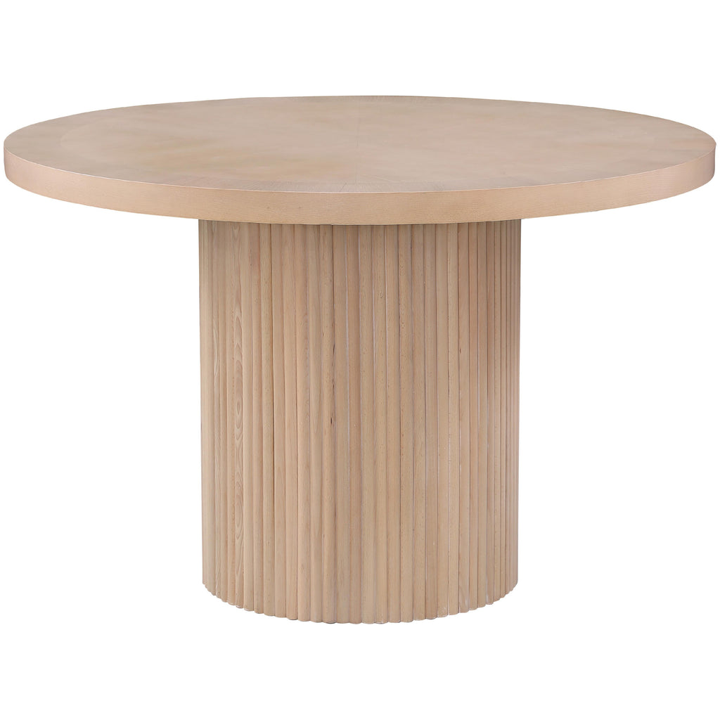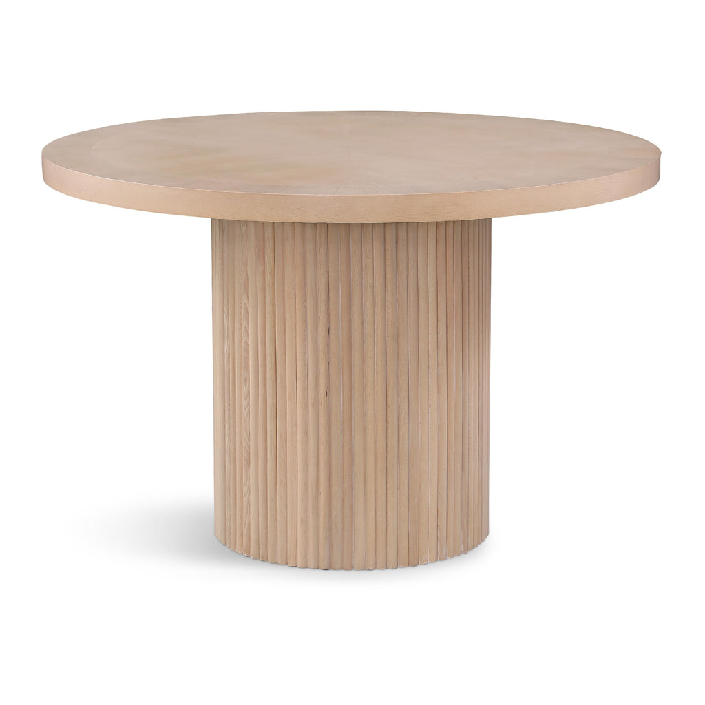 Give your dining room or eat-in kitchen a casual vibe with this Belinda dining table. A solid wood base and resilient construction offers impeccable durability and remarkable beauty. The round top rests on the fluted base, providing oodles of elbow room for family and friends to get comfortable while they nosh on their meal. The chair's made from wood and wood products for resilience, and its neutral natural finish lets it mesh well with the dining chairs or stools of your choice.