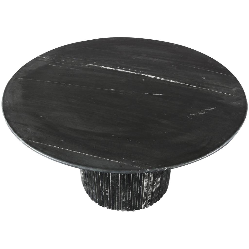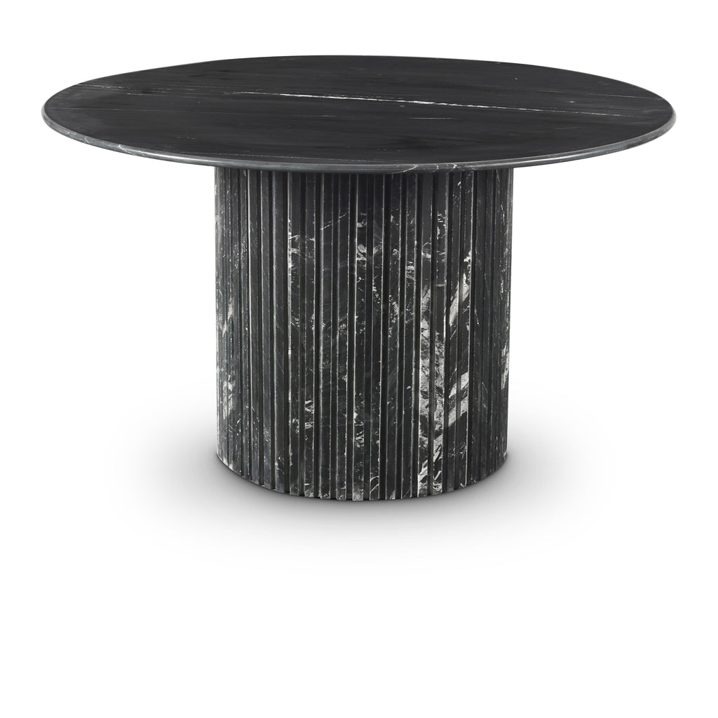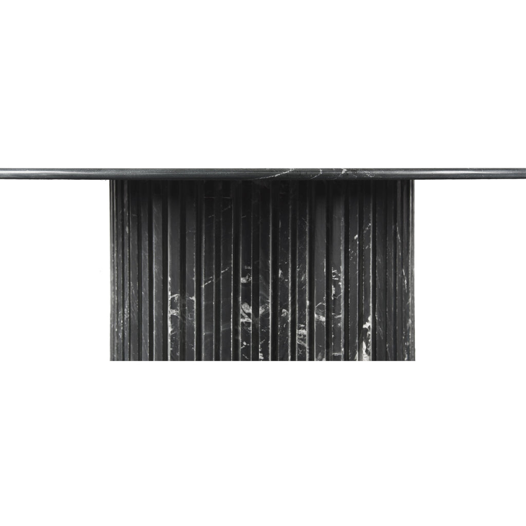 Add a refined look to your room with this handcrafted black Genoa dining table, a stunning masterpiece that marries elegance and practicality. Crafted from genuine marble, each table is a unique work of art, featuring a black marble top with intricate white veining. The fluted marble base adds a touch of art deco design, making it a statement piece in any room and adding to its heirloom-quality design.