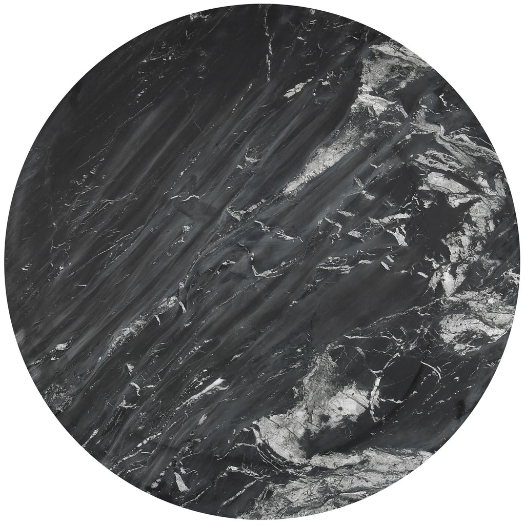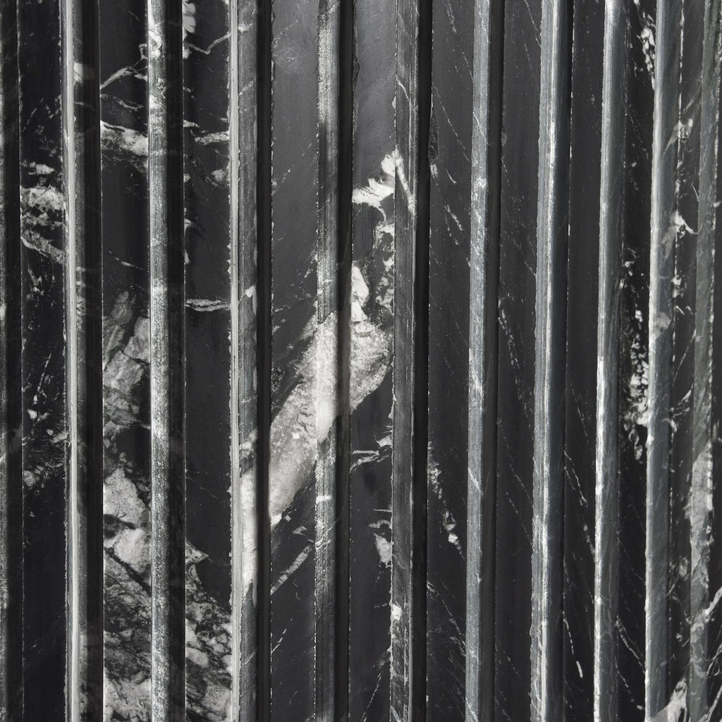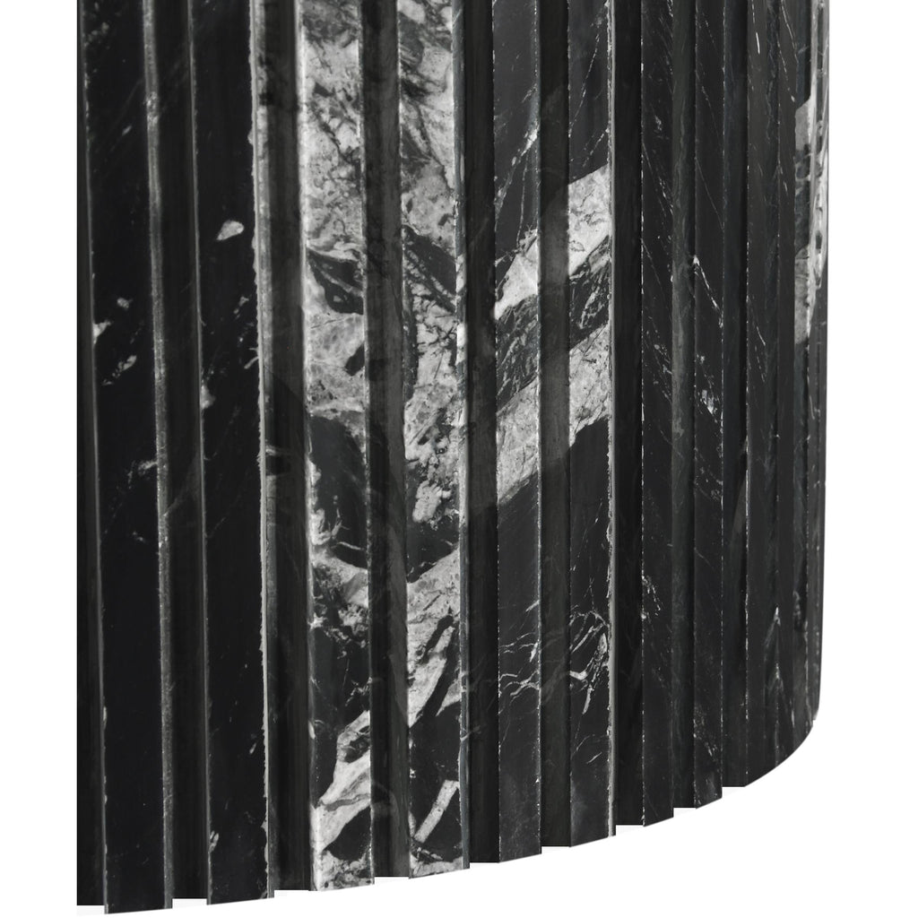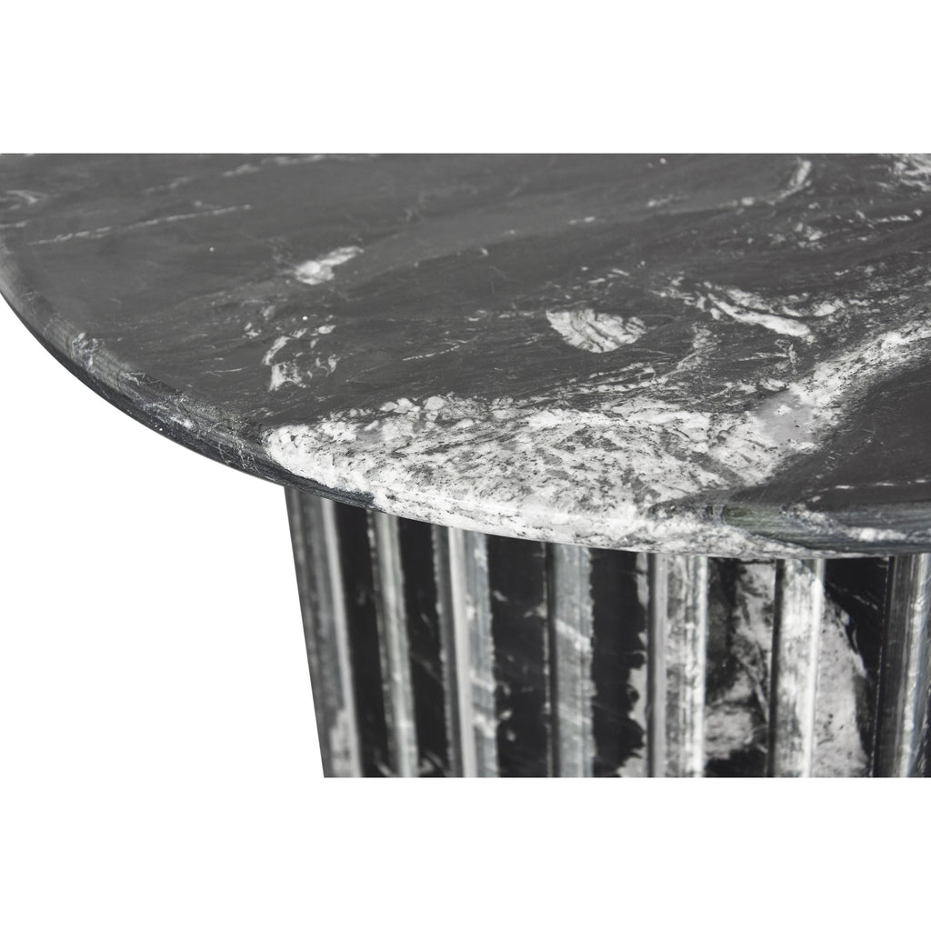 Add a refined look to your room with this handcrafted black Genoa dining table, a stunning masterpiece that marries elegance and practicality. Crafted from genuine marble, each table is a unique work of art, featuring a black marble top with intricate white veining. The fluted marble base adds a touch of art deco design, making it a statement piece in any room and adding to its heirloom-quality design.