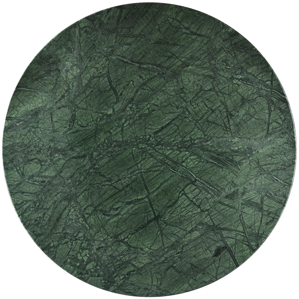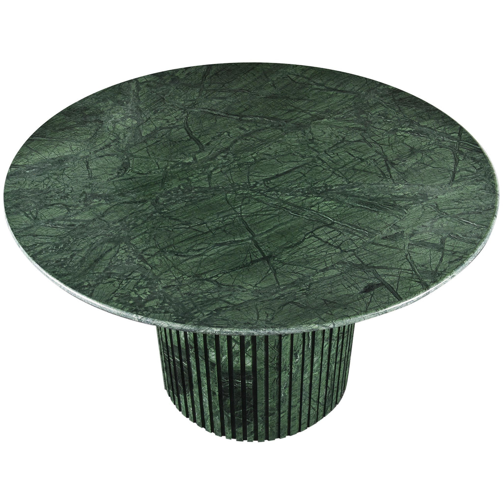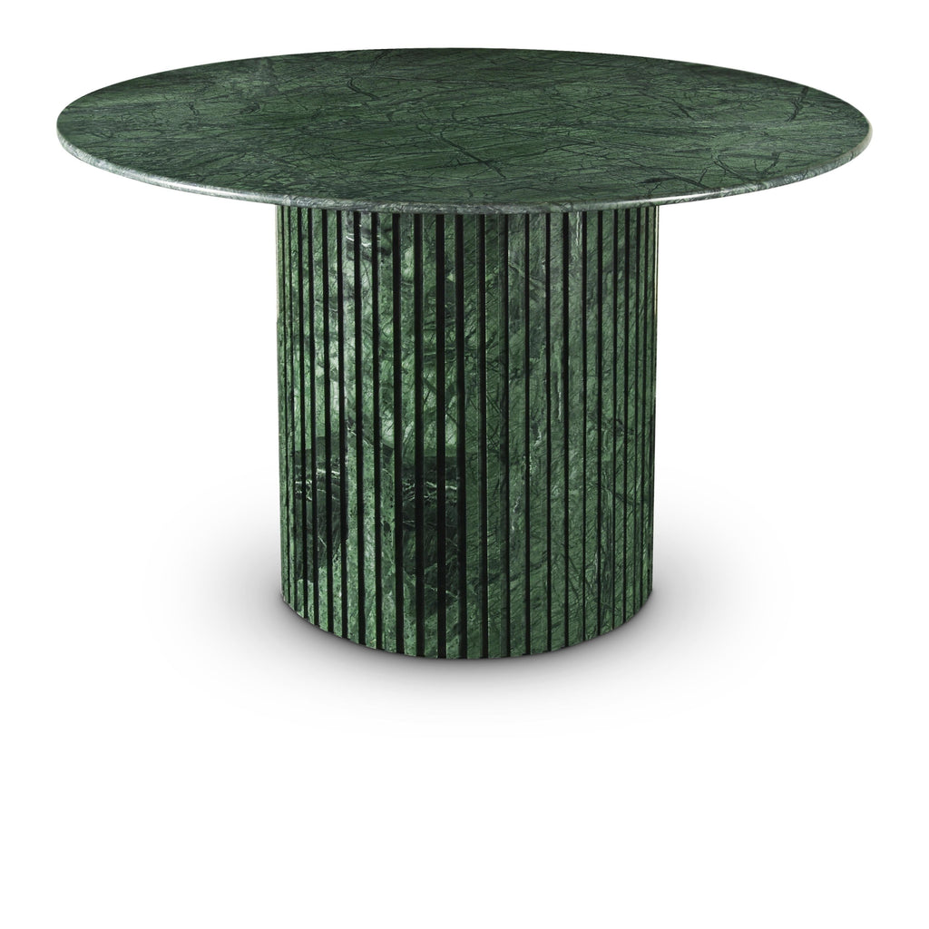Add a refined look to your room with this handcrafted green Genoa dining table, a stunning masterpiece that marries elegance and practicality. Crafted from genuine marble, each table is a unique work of art, featuring a green marble top with intricate white veining. The fluted marble base adds a touch of art deco design, making it a statement piece in any room and adding to its heirloom-quality design.