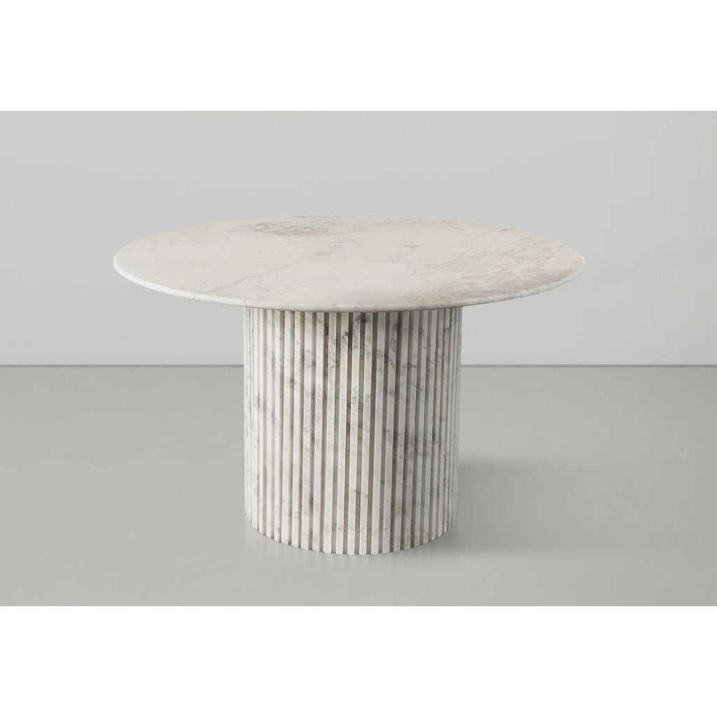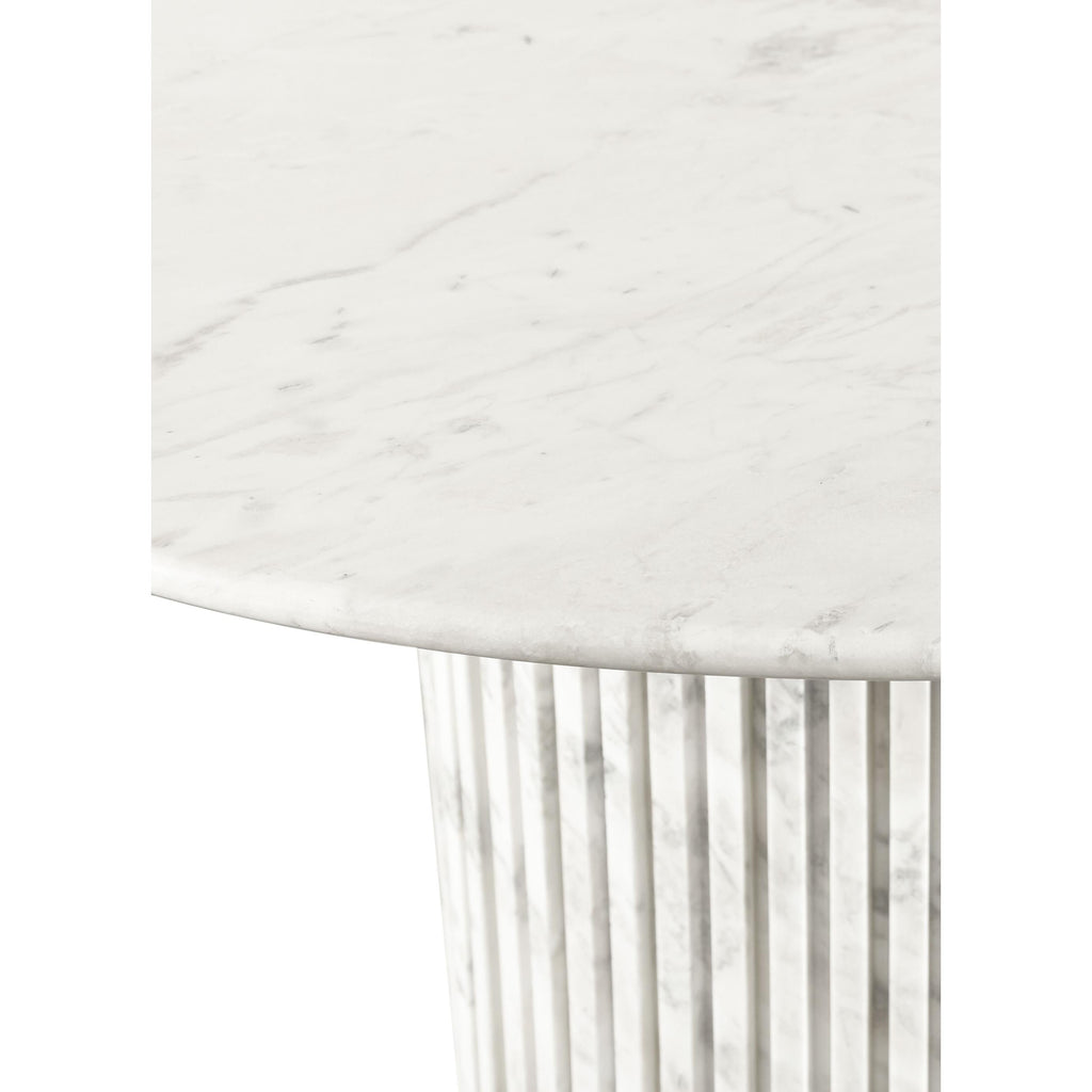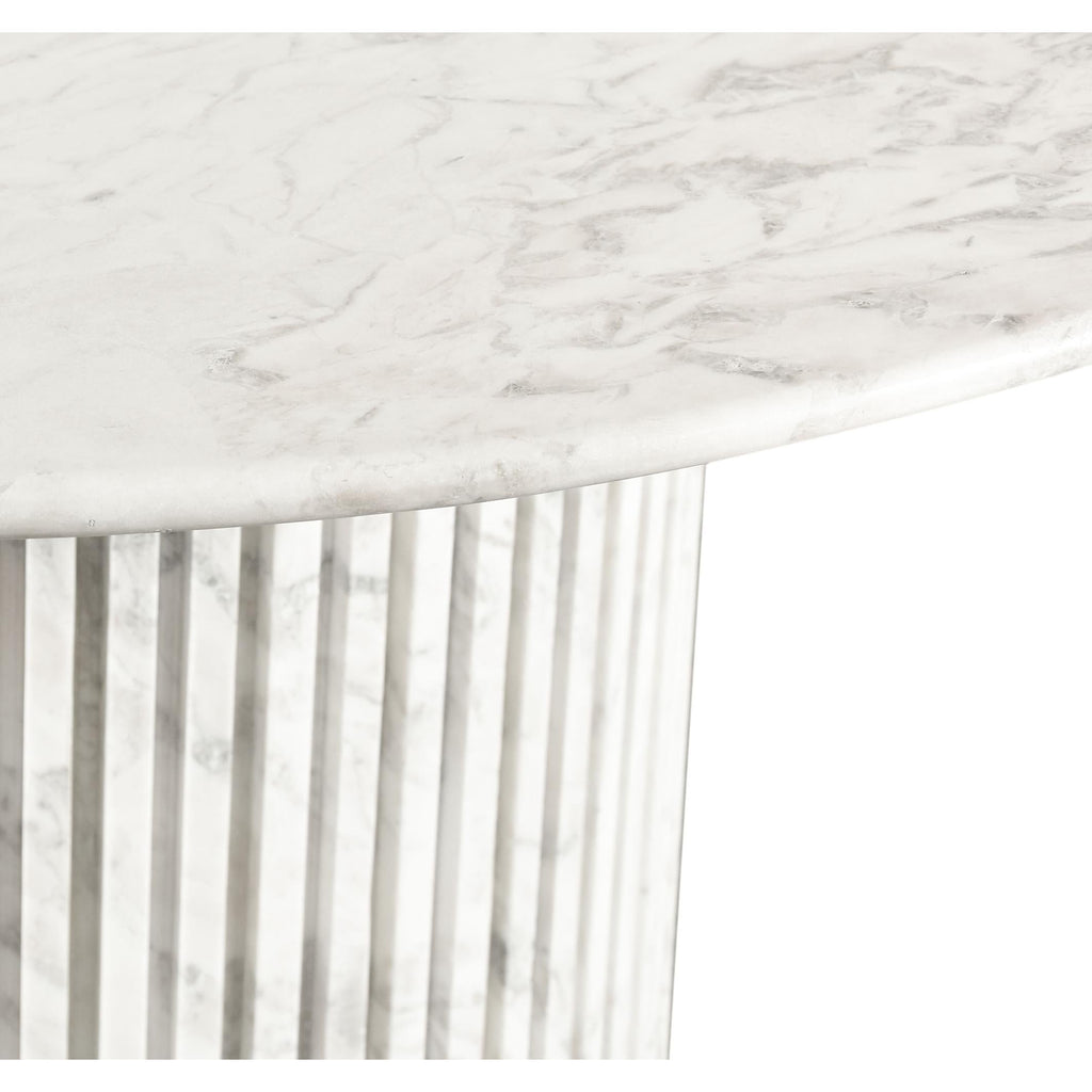 Add a refined look to your room with this handcrafted white Genoa dining table, a stunning masterpiece that marries elegance and practicality. Crafted from genuine marble, each table is a unique work of art, featuring a white marble top with intricate white veining. The fluted marble base adds a touch of art deco design, making it a statement piece in any room and adding to its heirloom-quality design.
