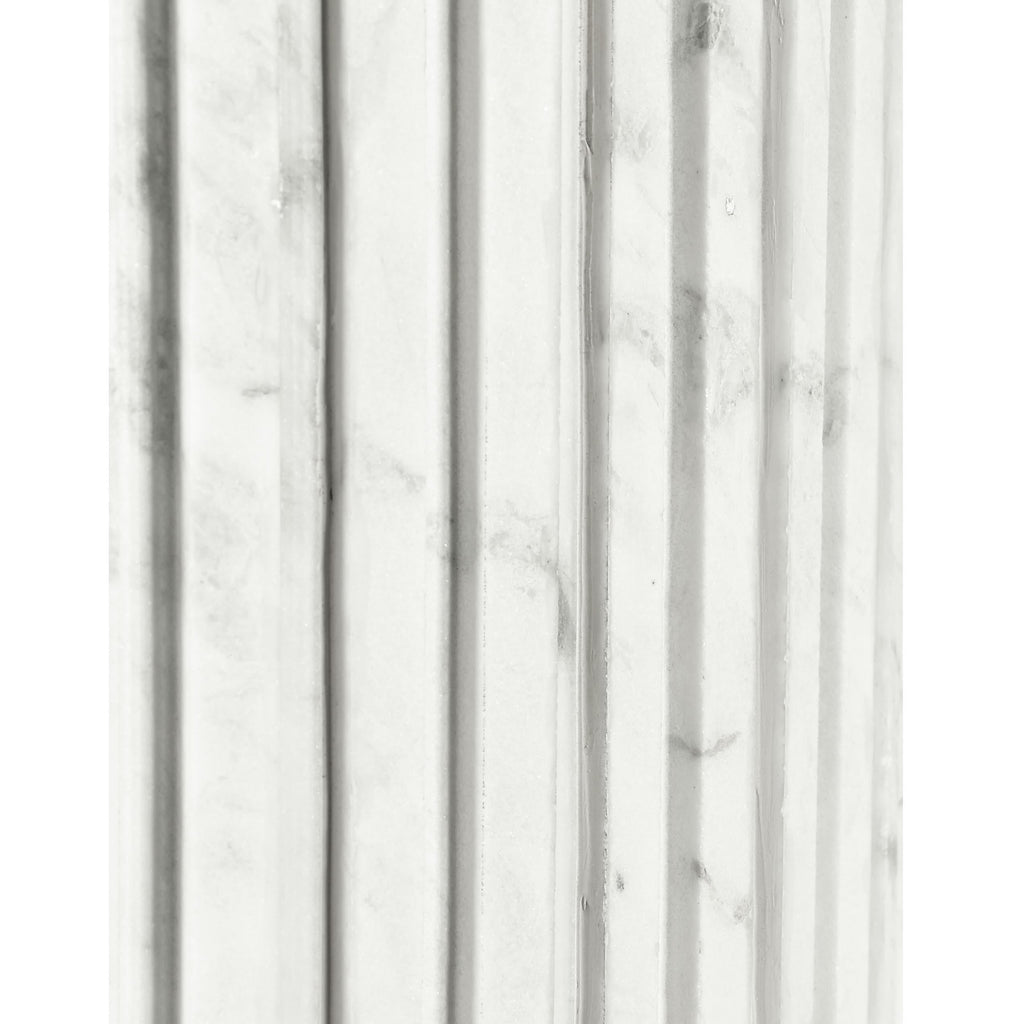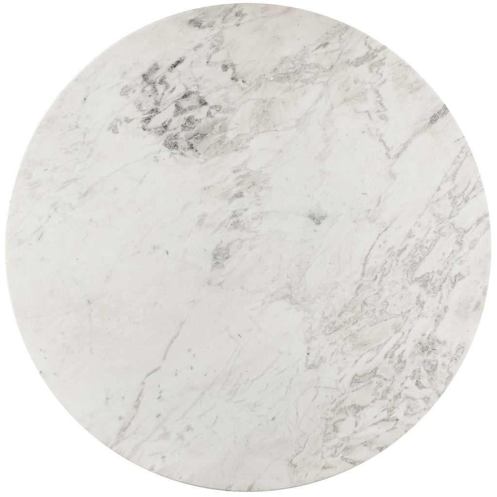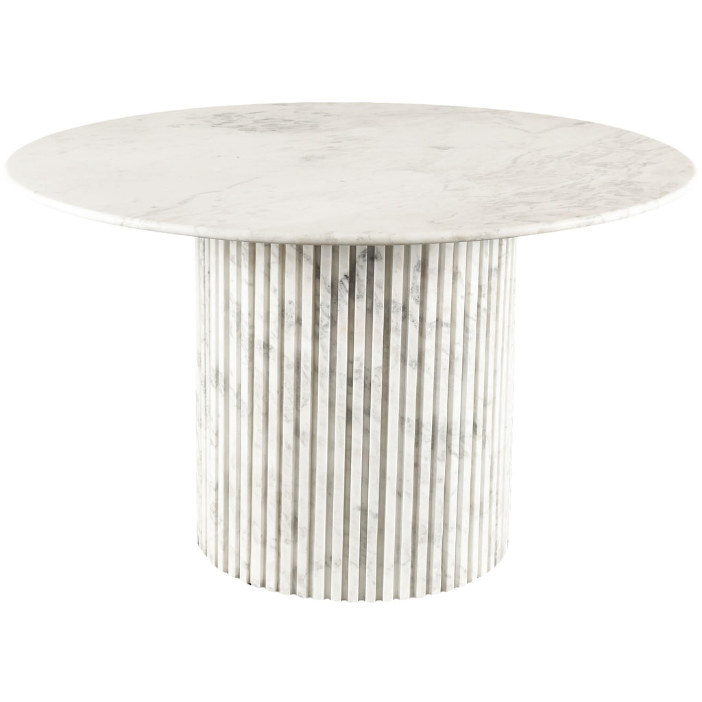 Add a refined look to your room with this handcrafted white Genoa dining table, a stunning masterpiece that marries elegance and practicality. Crafted from genuine marble, each table is a unique work of art, featuring a white marble top with intricate white veining. The fluted marble base adds a touch of art deco design, making it a statement piece in any room and adding to its heirloom-quality design.