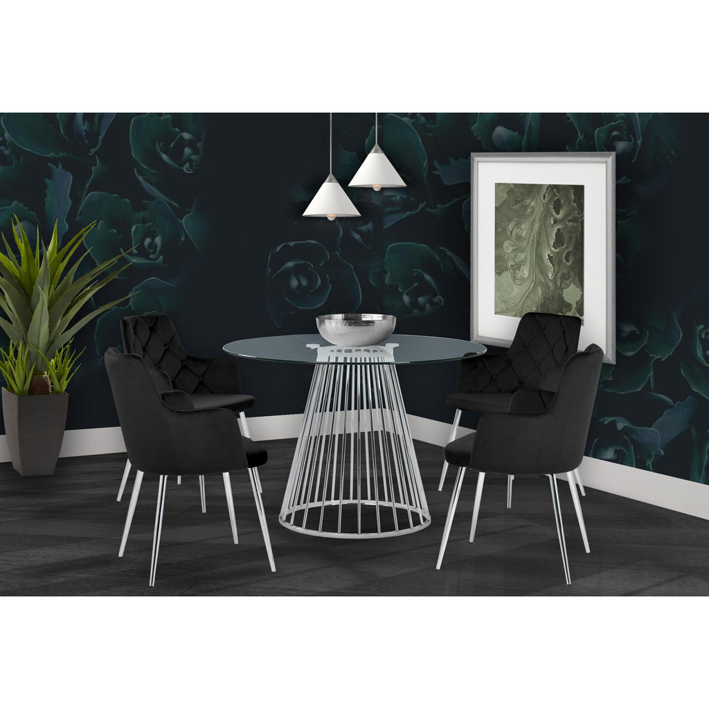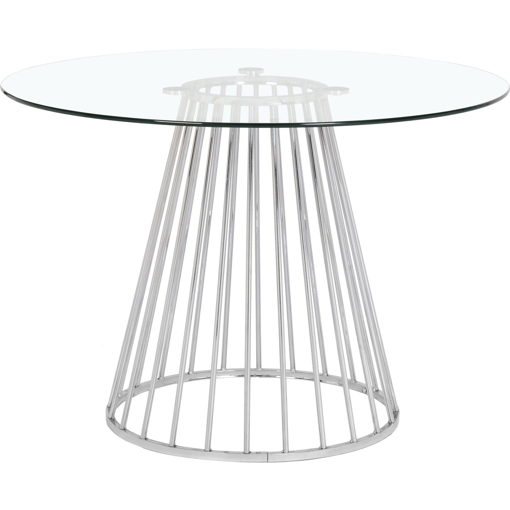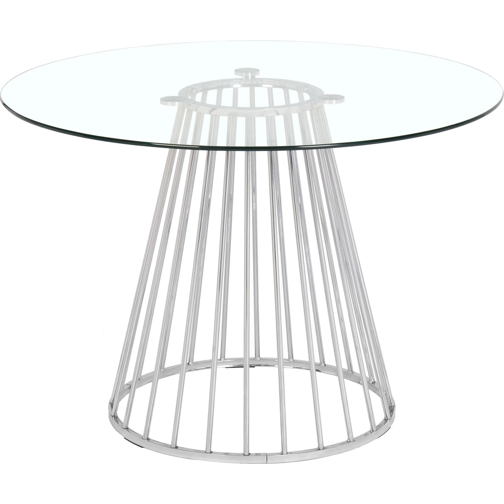 Add a bold touch to your dining area with this chic Gio dining table. Featuring a round, clear tempered glass tabletop and a polished chrome metal base with a wired contemporary design, this dining table transforms your dining space into a stylish haven. At 48 inches round and 30 inches high, this stunning table offers ample space for you to gather around and enjoy a family meal, while adding drama to your existing modern decor.