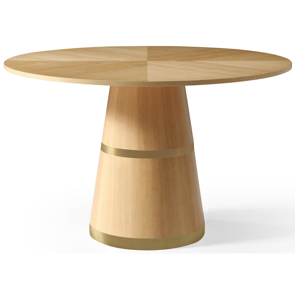 Bring a modern touch to your kitchen or dining area with this Hans white oak wood dining table. This round table is sized for an easy fit in any dining space. Its round tabletop features a white lacquer finish, giving it a high glossy appearance perfect for your contemporary home. Double gold metal stripes on the base add just enough flair to make this an eye-catching piece, and its wood construction ensures sturdiness that will last for years to come.