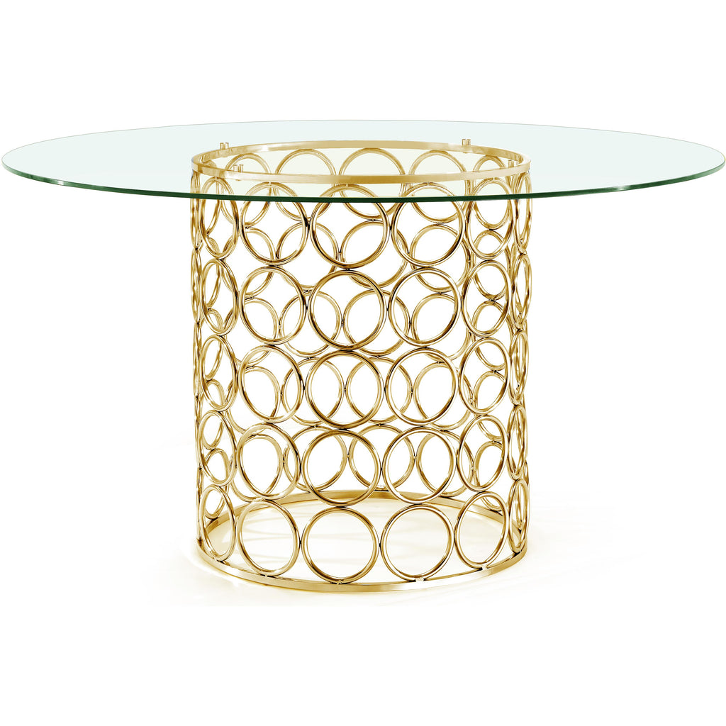 Bring a fresh new look to your dining room with the Opal Collection from Meridian Furniture. The intertwined geometric format that forms the table's gold stainless steel base and the chair's backs makes them a must for modern decor, while sleek metal frames on the chairs provide a contemporary look with the durability of metal to ensure the set's long-lasting beauty.