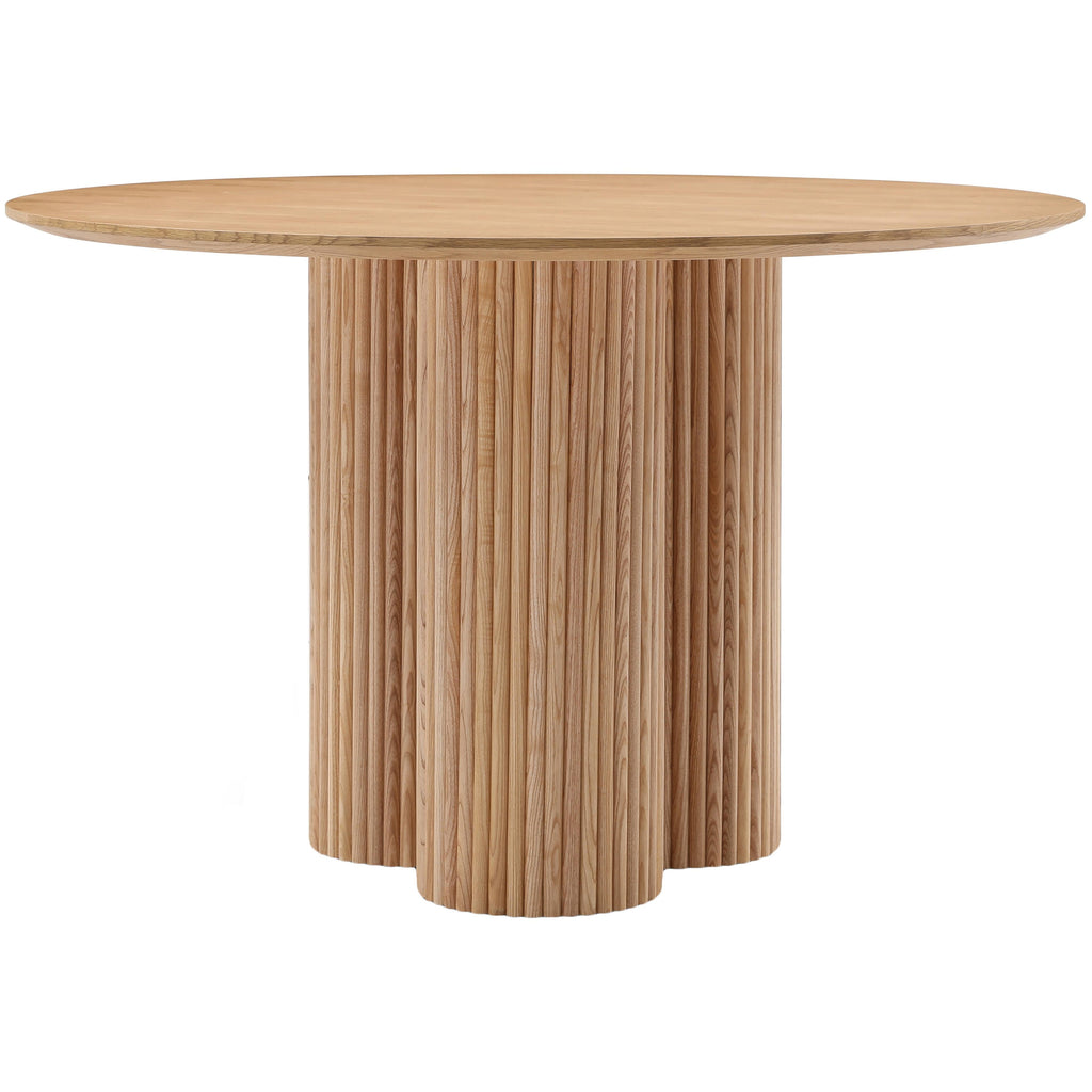Gather your favorite peeps around this Simba dining table. A sleek shade of white, this handsome mid-century designed table has a modish look that's perfect for both contemporary and traditional dining rooms. The natural oak veneer table top measures 48 inches, giving you oodles of room for place settings and lots of elbowroom for dinner guests. Made from ash wood and wood products, this sturdy table has a solid wood fluted base for added aesthetics.