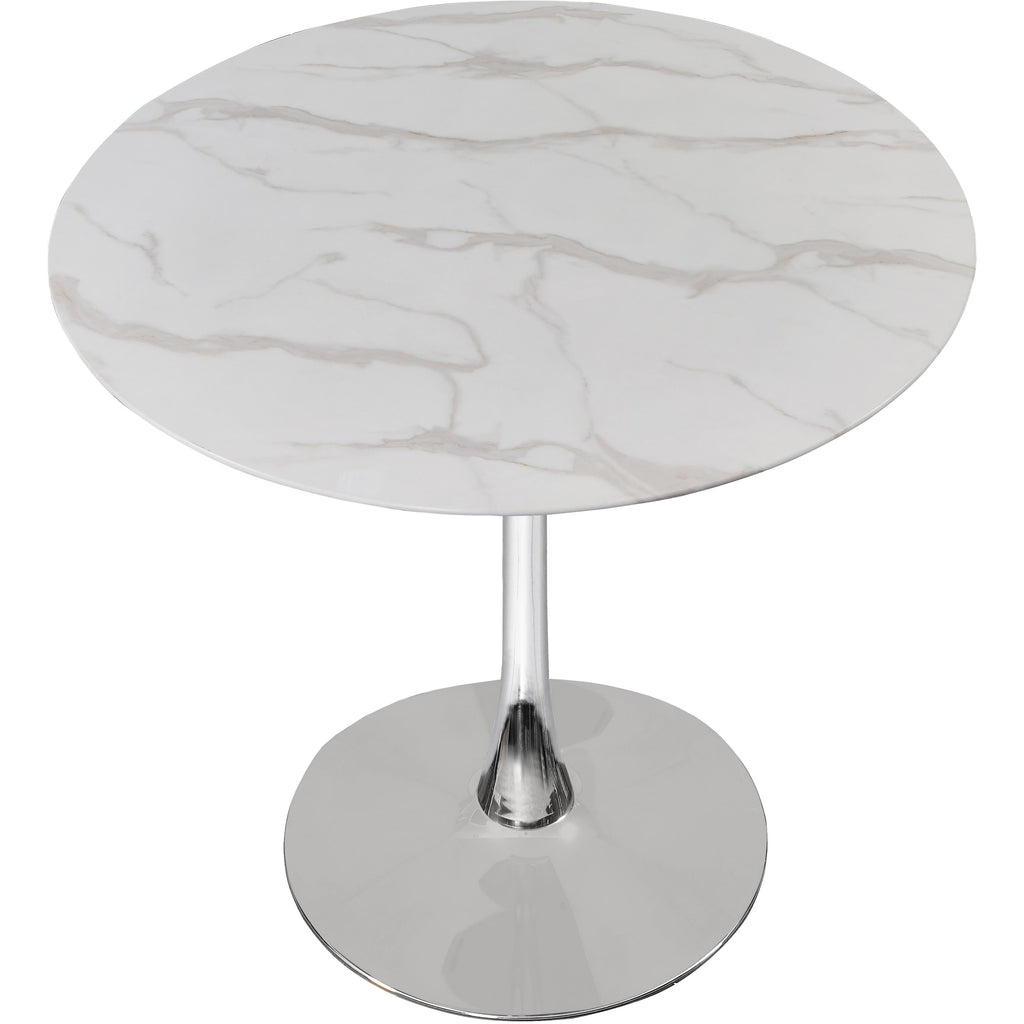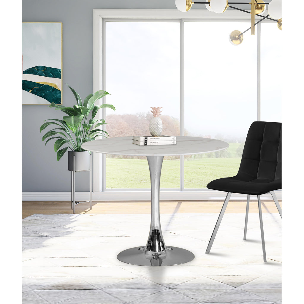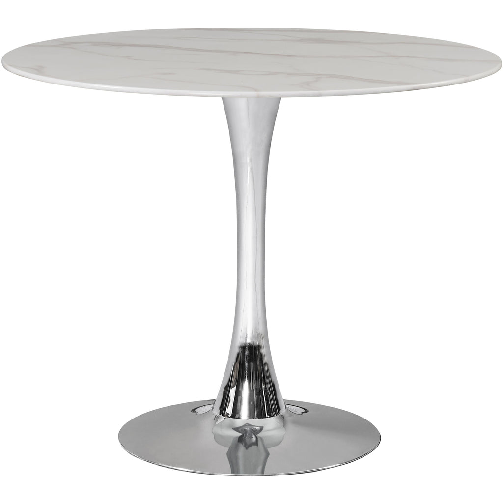Add the Holly 36" dining table to your kitchen, den or office to enjoy its petite size and elegant lines. The tabletop is made of 10MM thick glass with a glamorous marble veneer. A shiny silver pedestal base adds to the appeal of this gorgeous piece, and lets it fit into smaller spaces comfortably. Choose from a wide array of available matching chair styles to complete your contemporary style decor.