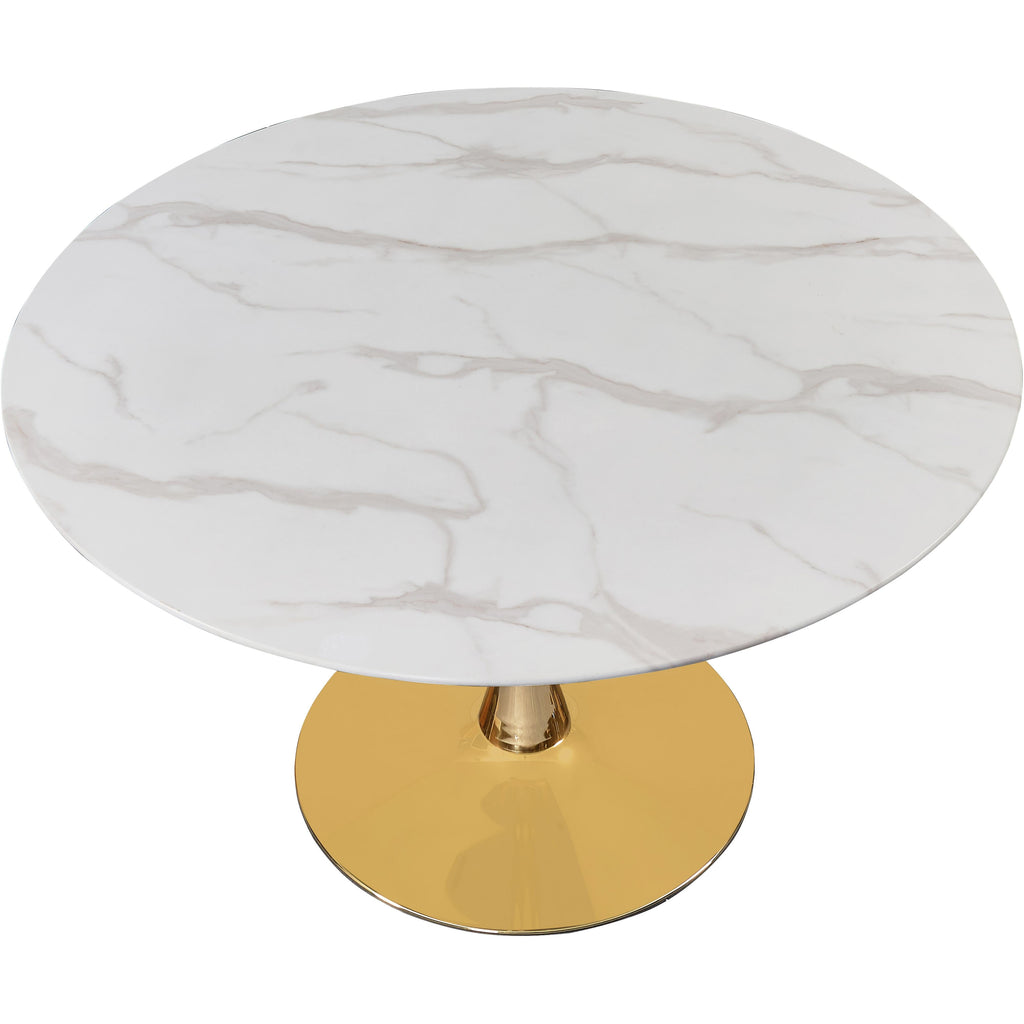 Add the Holly 48" dining table to your kitchen, den or office to enjoy its petite size and elegant lines. The tabletop is made of 10MM thick glass with a glamorous marble veneer. A shiny gold pedestal base adds to the appeal of this gorgeous piece, and lets it fit into smaller spaces comfortably. Choose from a wide array of available matching chair styles to complete your contemporary style decor.