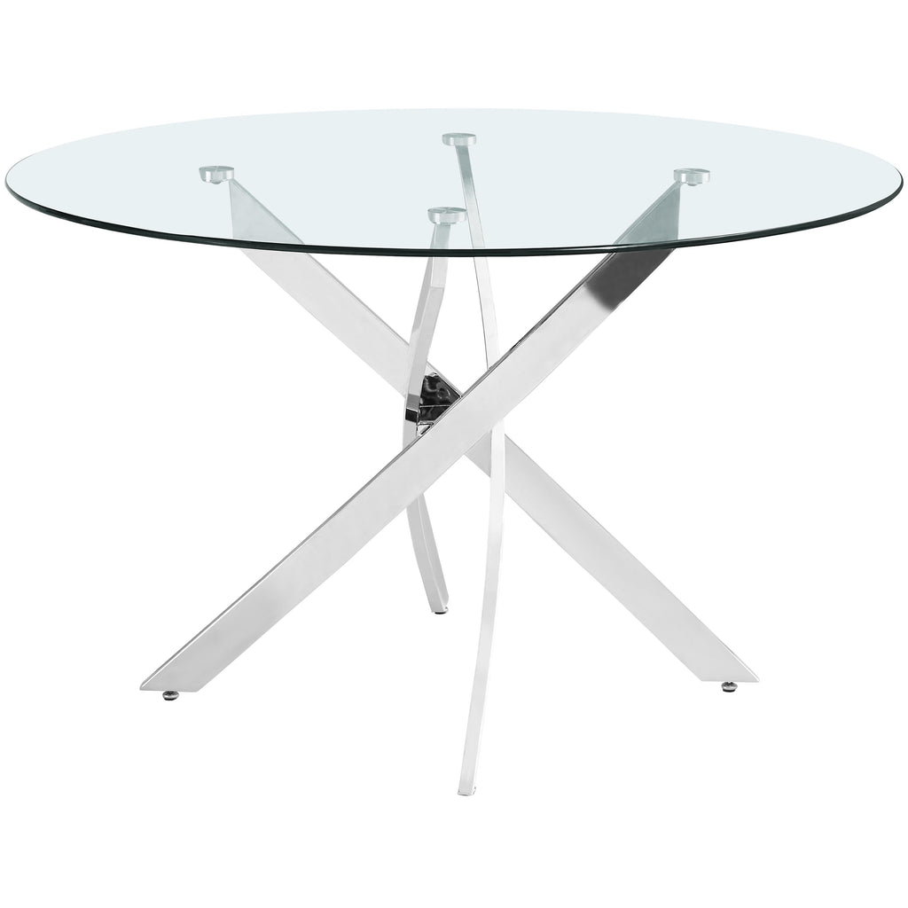 Contemporize your dining area with this Xander chrome dining table. Featuring a round, glass tabletop and a unique, chrome metal base, this dining table is perfect for the home with modern decor. Its round, tempered glass tabletop is 48-inches in diameter, providing you with plenty of room to feed the whole family or to entertain dinner guests. The tabletop also features 10mm glass thickness, ensuring it won't crack or break.