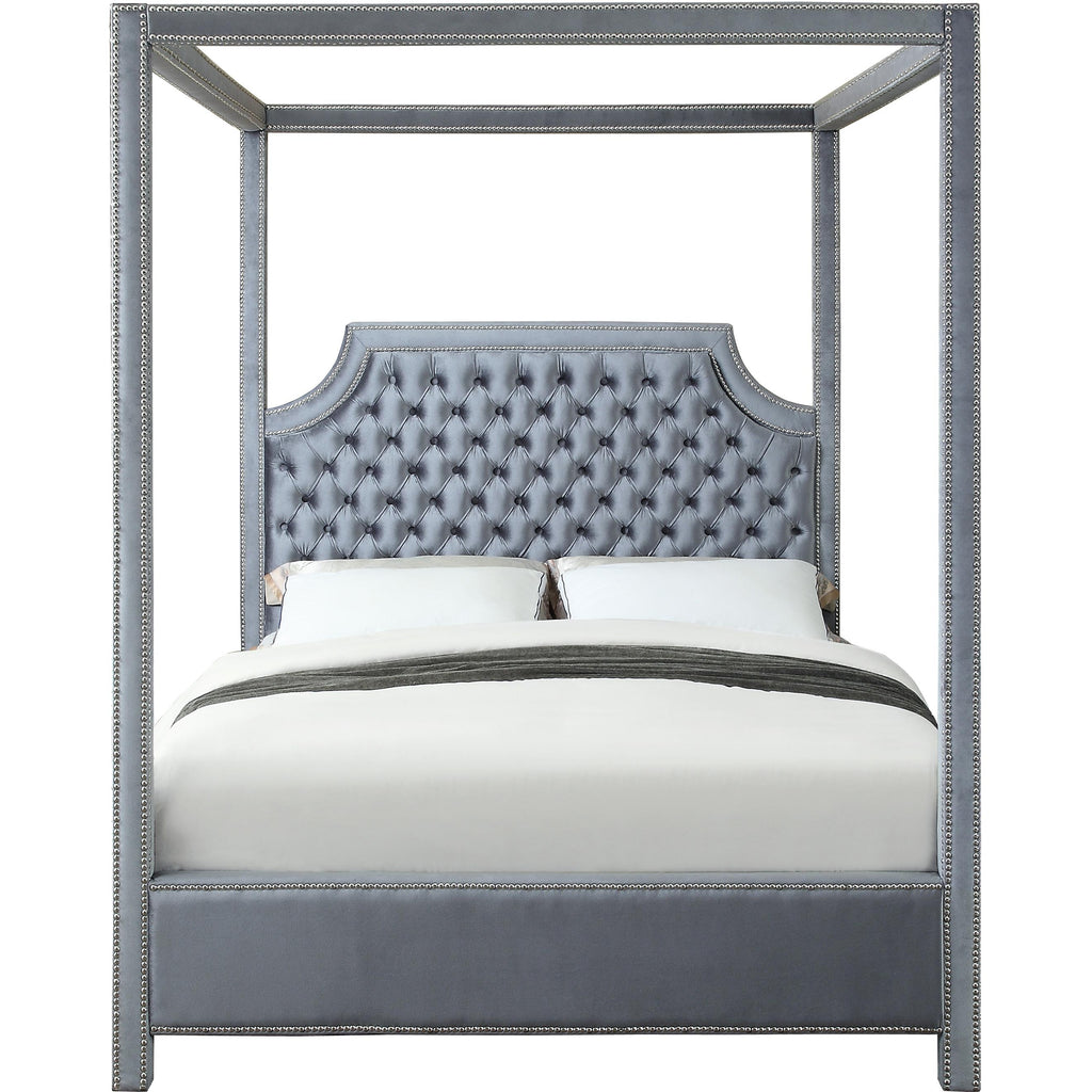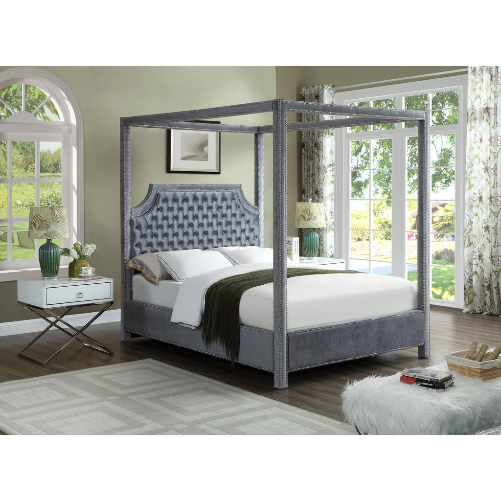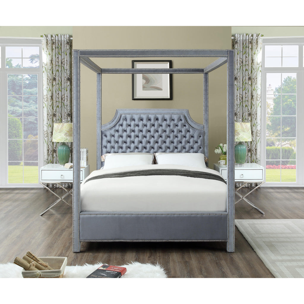 Ensure that every night's sleep is a dreamy escape with this Rowan Grey Velvet Bed as the centerpiece of your bedroom sanctuary. This bed features a velvet-clad canopy that beckons you to rest like royalty. The deeply detailed tufting on the scalloped headboard makes for a sumptuous presentation, and the chrome nail heads add to the luxe look of this exquisite bed.
