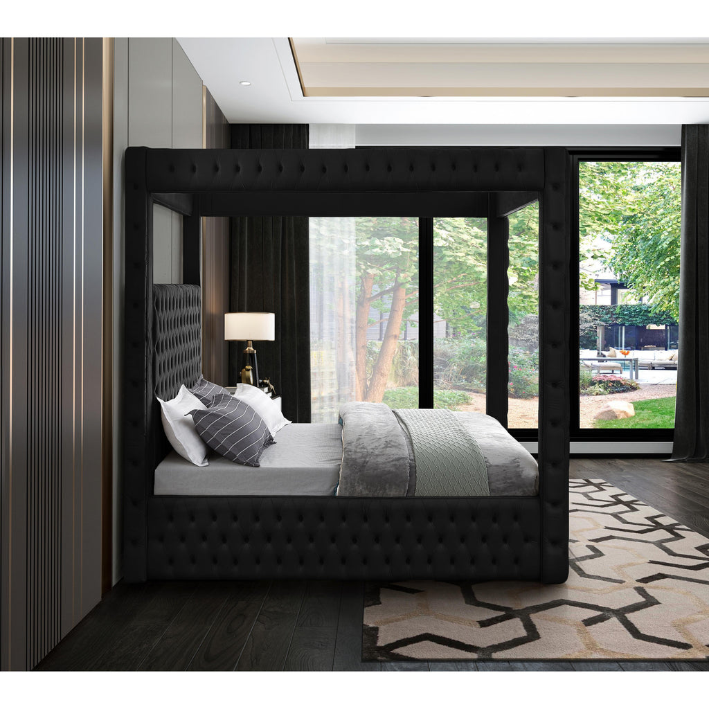 Create a bedroom sanctuary you never want to leave with this Royal velvet bed at its center. Justly named, this bed has a regal look that's fit for a king (or queen). Stunningly crafted, the Royal bed features a canopy that towers over the top of the bed for a modish take on a timelessly affluent design. Deep tufting adds a textural look while the soft black velvet upholstery shores up the bed's sophisticated design.