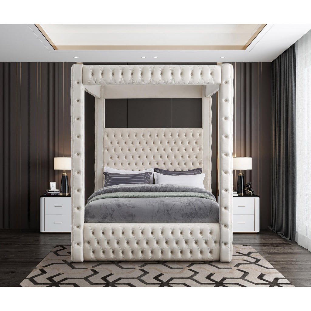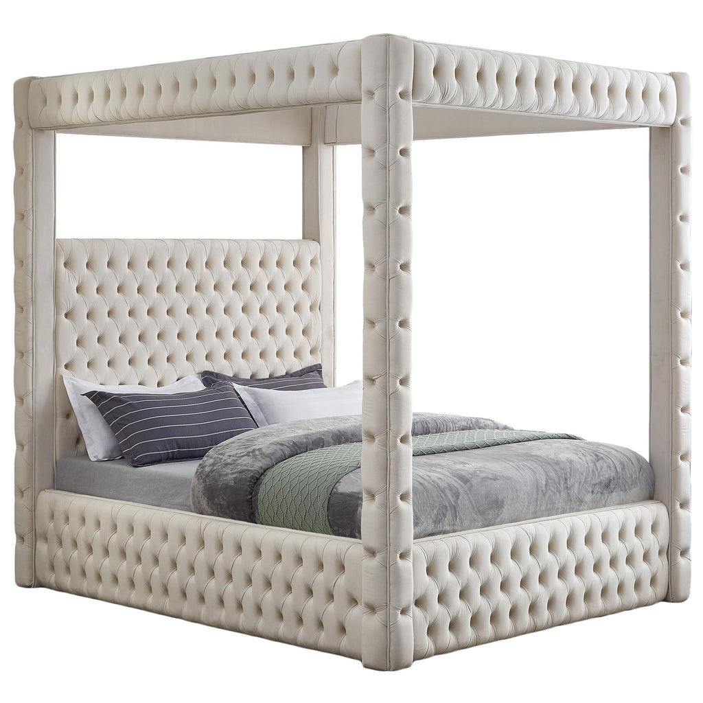 Create a bedroom sanctuary you never want to leave with this Royal velvet bed at its center. Justly named, this bed has a regal look that's fit for a king (or queen). Stunningly crafted, the Royal bed features a canopy that towers over the top of the bed for a modish take on a timelessly affluent design. Deep tufting adds a textural look while the soft cream velvet upholstery shores up the bed's sophisticated design.