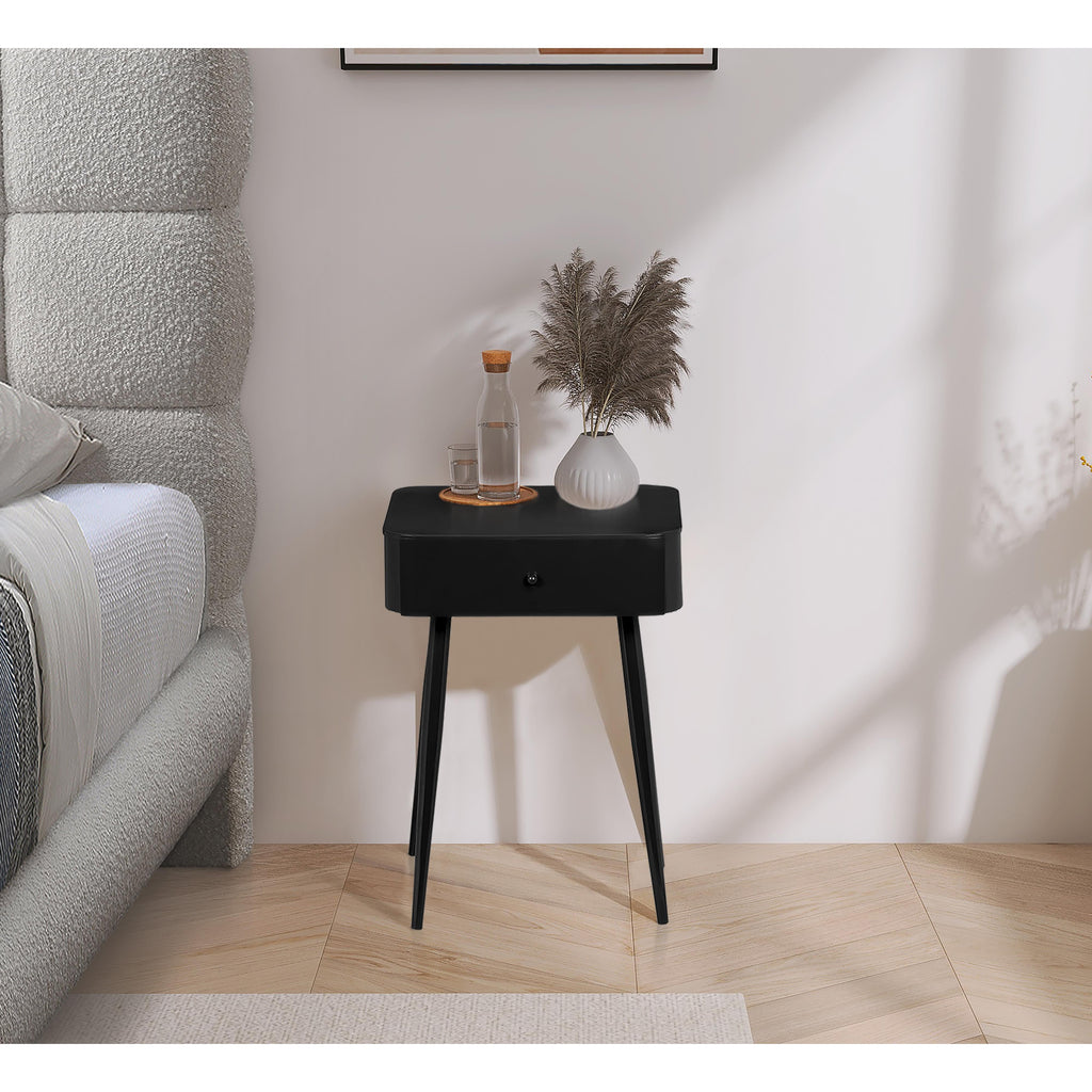 Give your bedroom a refresh with this black Rylan nightstand, a versatile piece that balances style and usability. This nightstand is made from robust black metal for durability and modern appeal and features a single storage drawer to keep your nighttime essentials neatly organized. The contemporary and minimalist design effortlessly complements various decor styles, making it a sleek addition to your bedroom. It also doubles as a functional side table, offering not just storage but a clean, minimalist aesthetic.