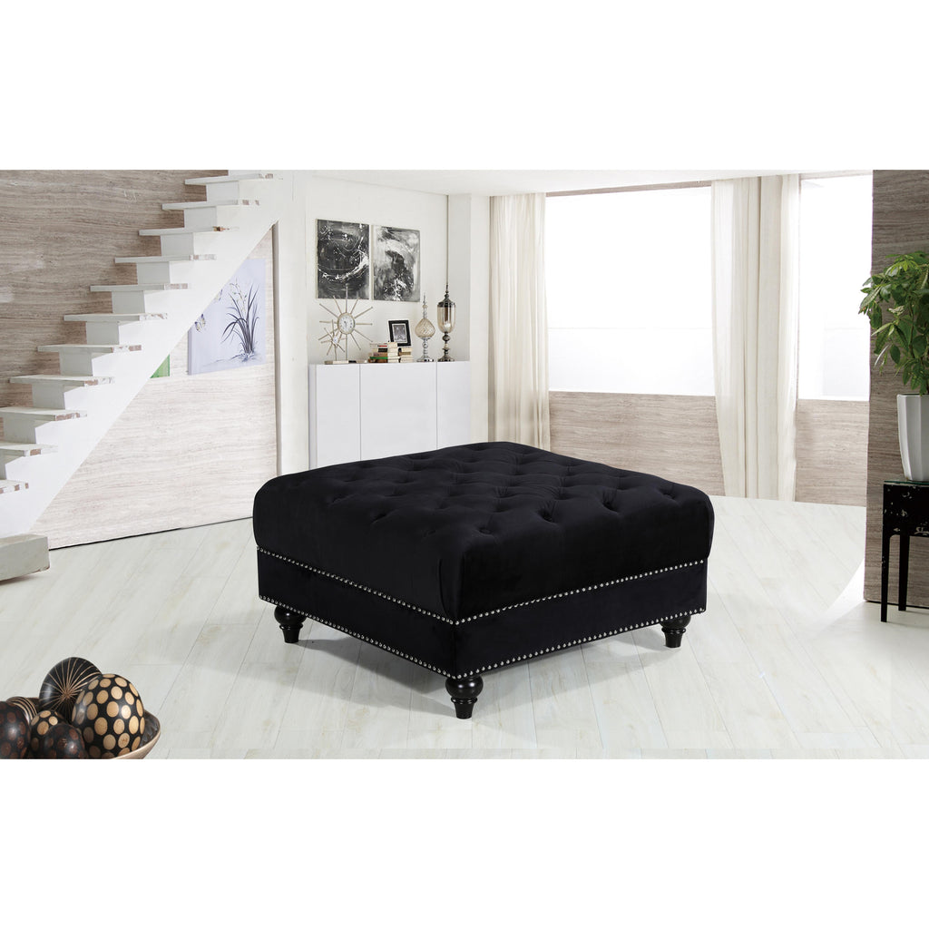 Take a load off when you prop your feet up on this Sabrina black velvet ottoman. This sumptuously elegant ottoman serves not only as a luxurious foot rest, but doubles as a seat when you have extra company over. The black velvet upholstery is rich and chic, and the addition of nail head trim adds to its sophisticated feel. Wooden legs with a turned design provide sturdy support for the unit, ensuring its long-lasting beauty and performance. Buy it on its own or as part of the Sabrina collection for a beautiful, cohesive look.