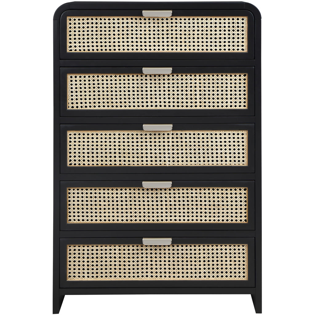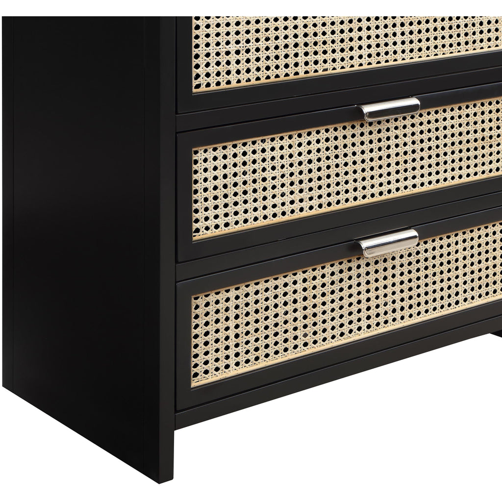 Bold design elements are the hallmark of this Sage wood chest. This beautiful chest features up-to-the-minute styling and a black finish that's perfect for your contemporary room. Natural cane details provide an exciting contrast that adds a robust finish to your bedroom look. Two sets of hardware come with this handsome chest so that you can give it your own unique, personal slant. A rich wood frame ensures lasting beauty and ongoing performance.