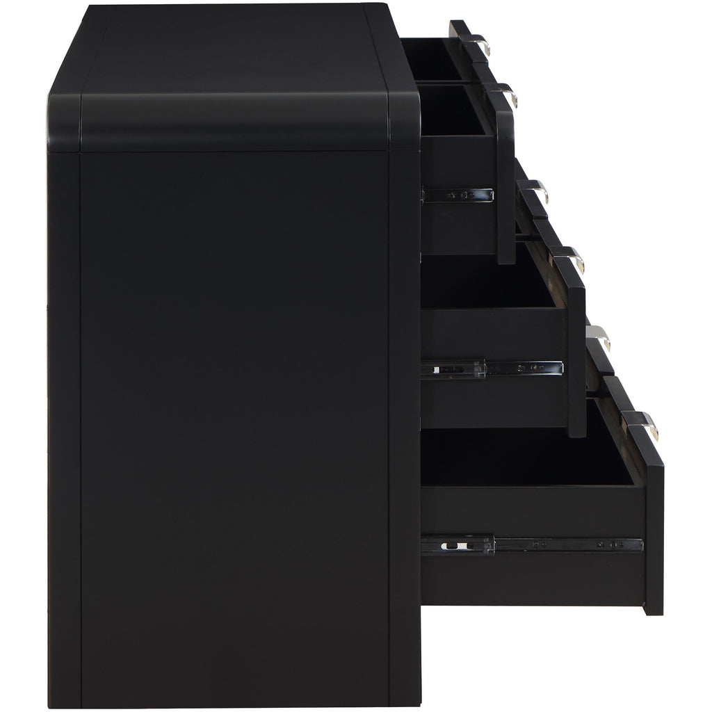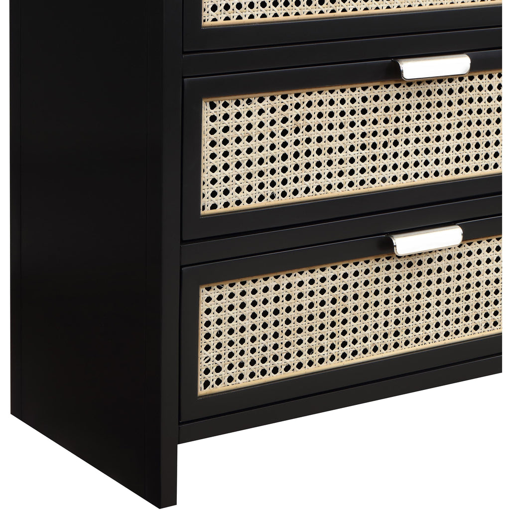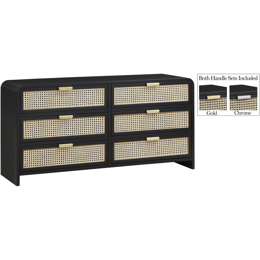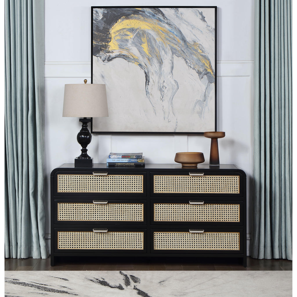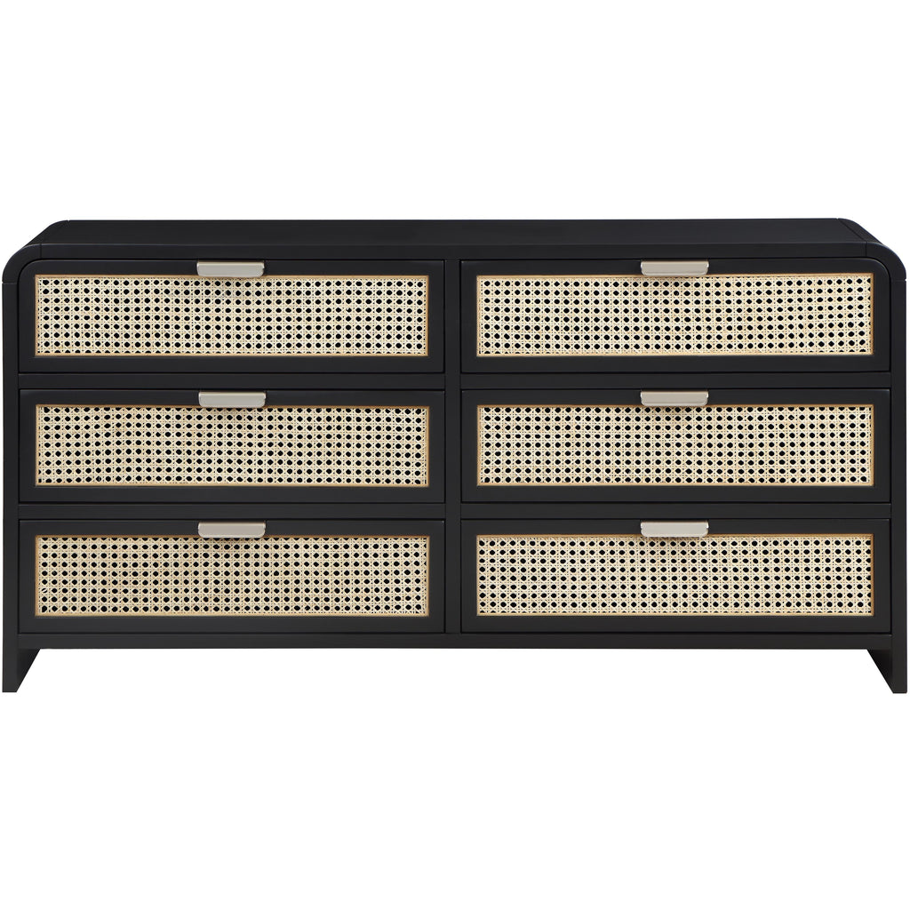 Bold design elements are the hallmark of this Sage wood dresser. This beautiful dresser features up-to-the-minute styling and a black finish that's perfect for your contemporary room. Natural cane details provide an exciting contrast that adds a robust finish to your bedroom look. Two sets of hardware come with this handsome dresser so that you can give it your own unique, personal slant. A rich wood frame ensures lasting beauty and ongoing performance.
