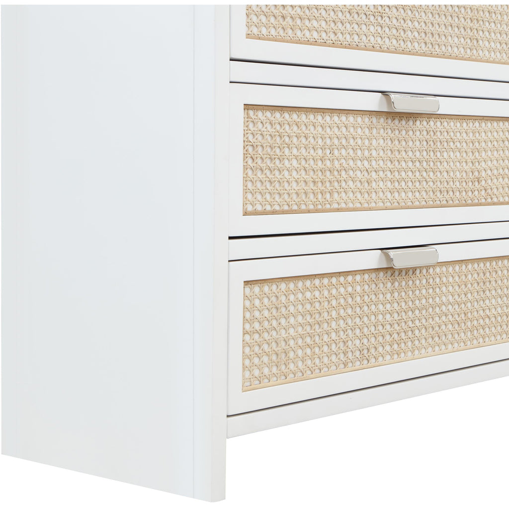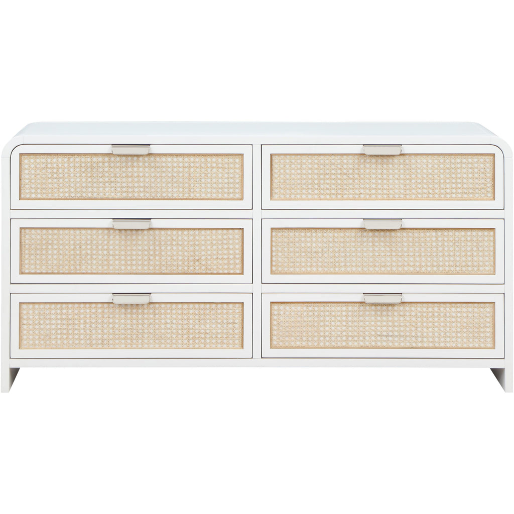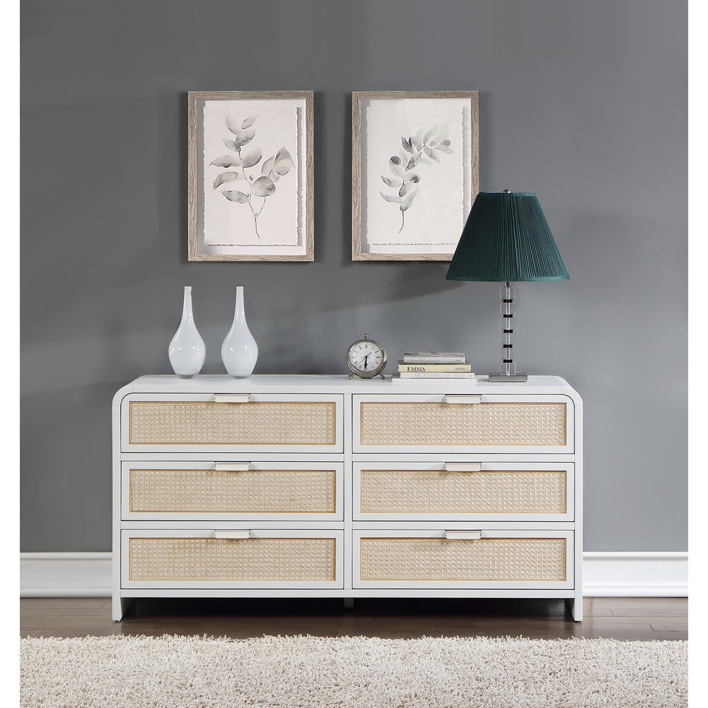 Bold design elements are the hallmark of this Sage wood dresser. This beautiful dresser features up-to-the-minute styling and a white finish that's perfect for your contemporary room. Natural cane details provide an exciting contrast that adds a robust finish to your bedroom look. Two sets of hardware come with this handsome dresser so that you can give it your own unique, personal slant. A rich wood frame ensures lasting beauty and ongoing performance.