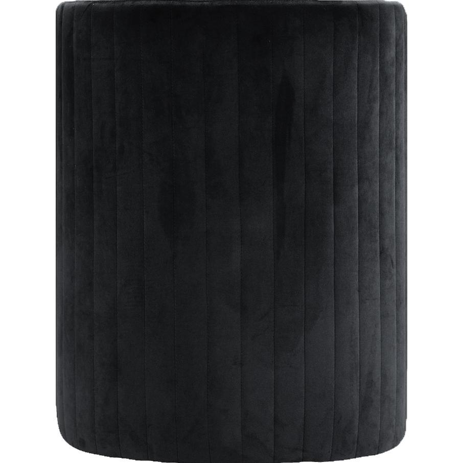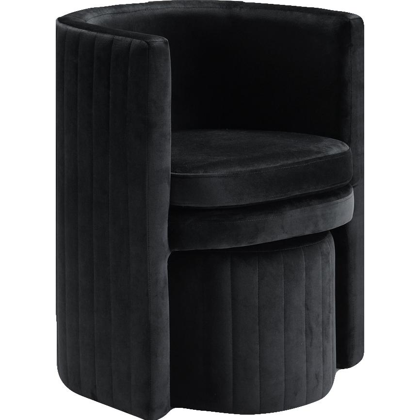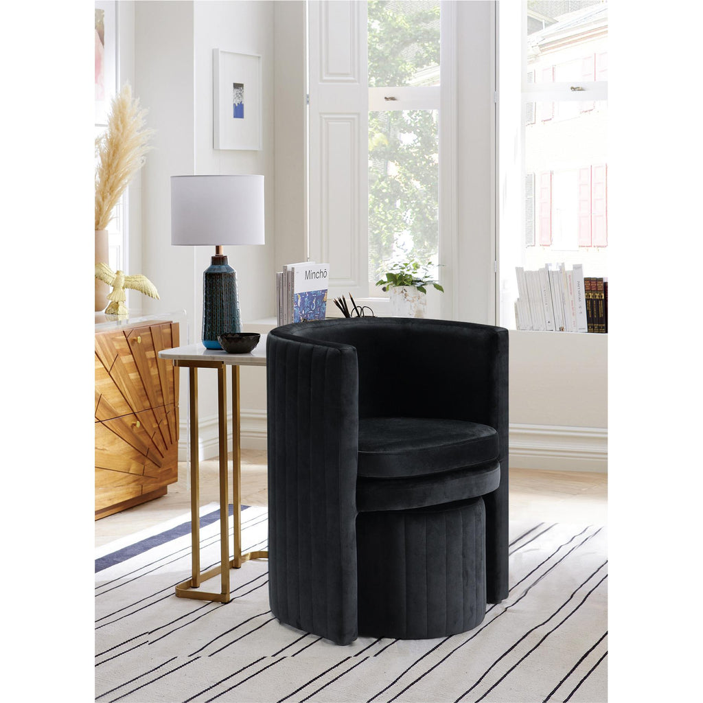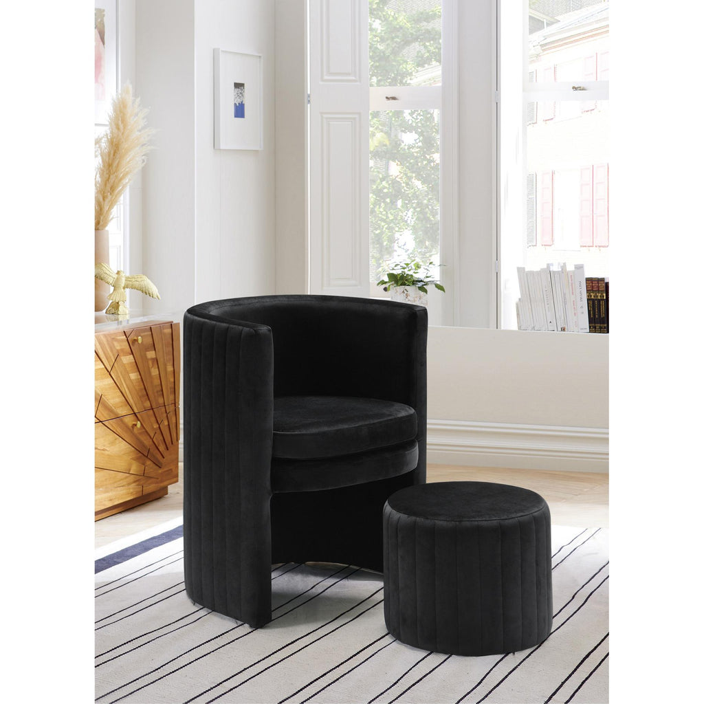 Create a chic atmosphere with this Selena Black Velvet Accent Chair. This handsome chair has a fun barrel design that lends contemporary charm to a bedroom, living room or sitting room. The chair and matching included ottoman are covered top to bottom in plush velvet for a sumptuous look. Channel tufting adds a visually exciting finish to this elegant pair.