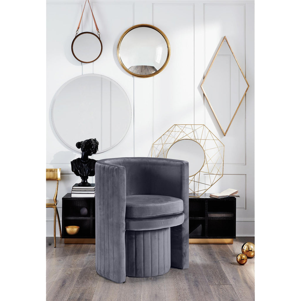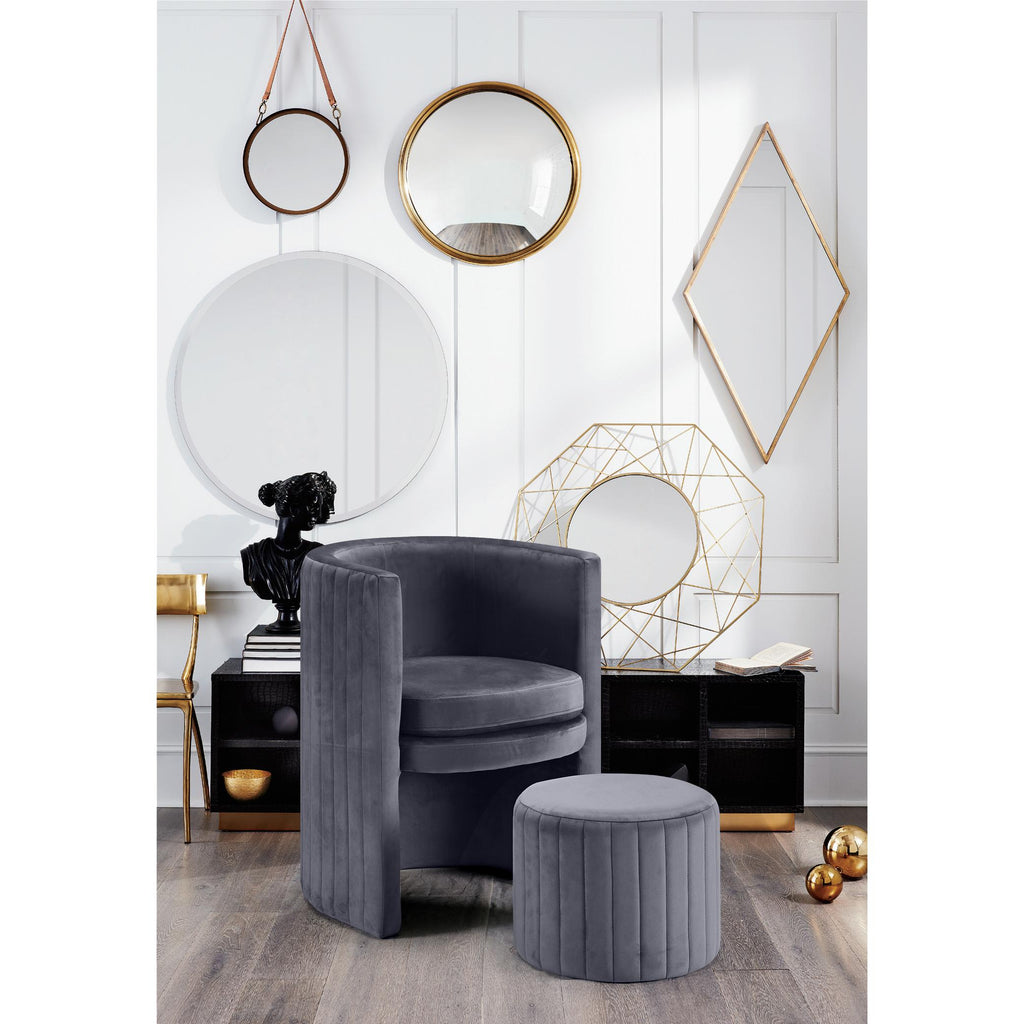 Create a chic atmosphere with this Selena Grey Velvet Accent Chair. This handsome chair has a fun barrel design that lends contemporary charm to a bedroom, living room or sitting room. The chair and matching included ottoman are covered top to bottom in plush velvet for a sumptuous look. Channel tufting adds a visually exciting finish to this elegant pair.