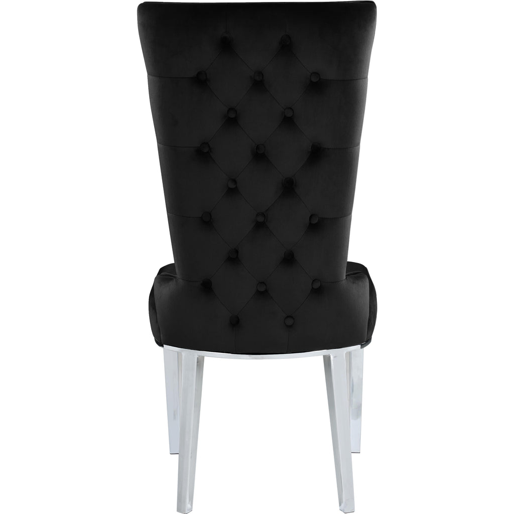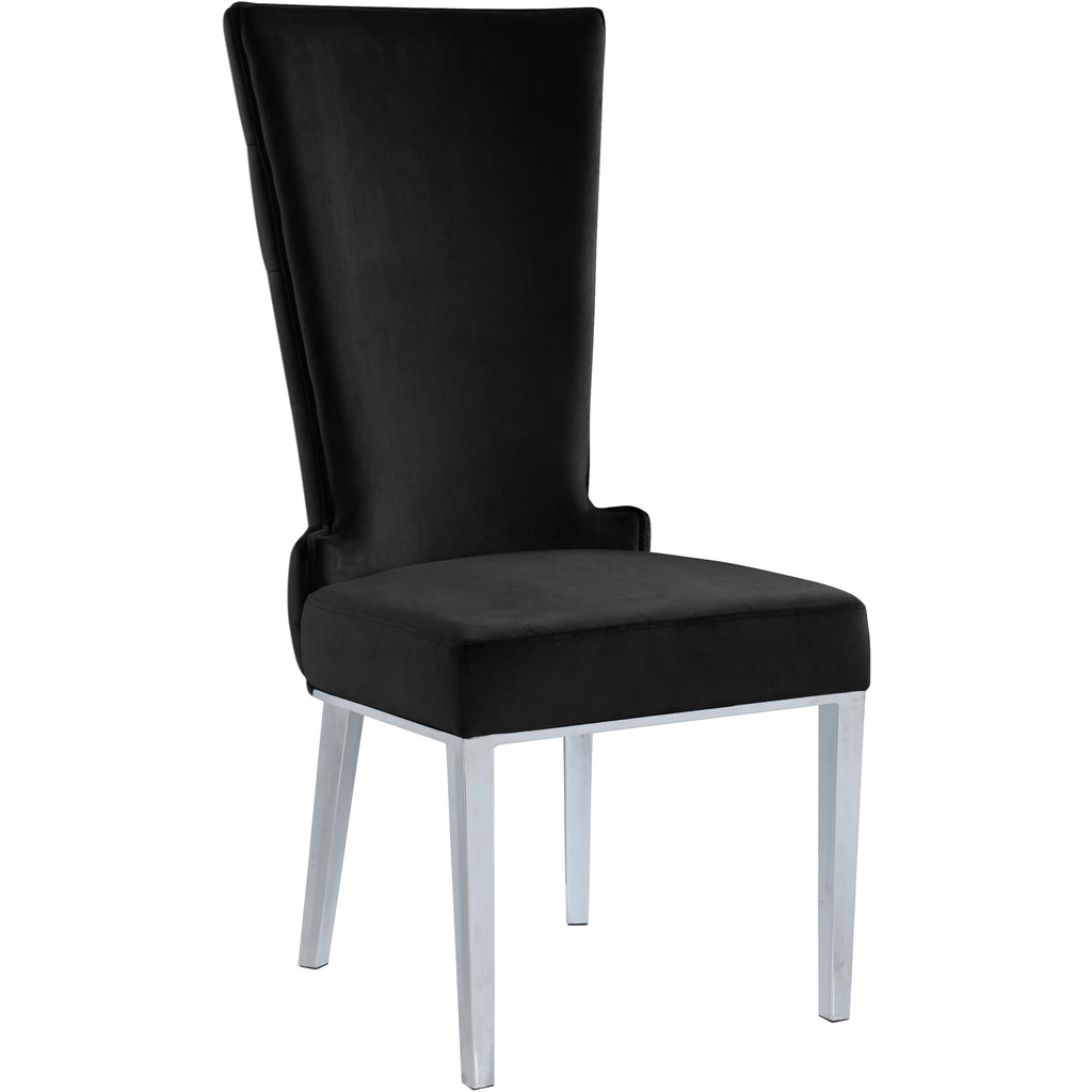 Draw the attention of anyone who steps foot in your living space with this Serafina Black Velvet Dining Chair from Meridian Furniture. Its luxurious black velvet upholstery is both soft and elegant, adding a chic touch to your home. Its high back with a deep button tufted design gives this stylish chair a regal appearance, while rich chrome metal legs complement its black color while providing sturdy support to the chair's frame.